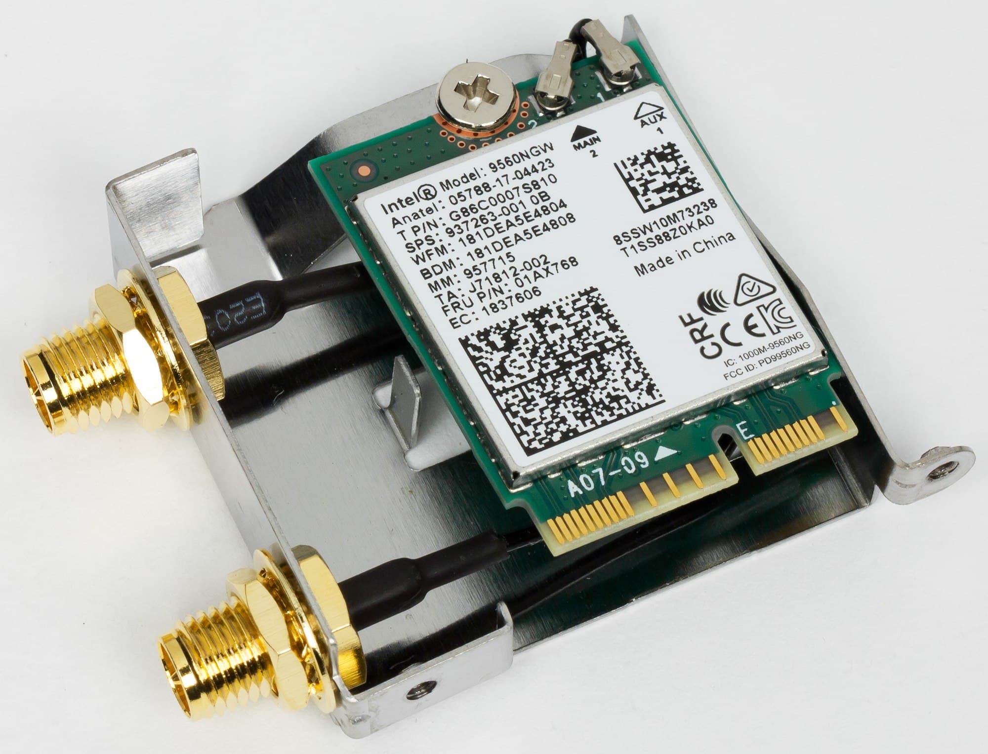 Беспроводные адаптеры Wi-Fi 802.11a/b/g/n/ac и Bluetooth 5.0 реализованы на контроллере Intel AC-9560. Он установлен в слот M.2 (E-key), и его разъемы для привинчивания выносных антенн выведены на заднюю панель.