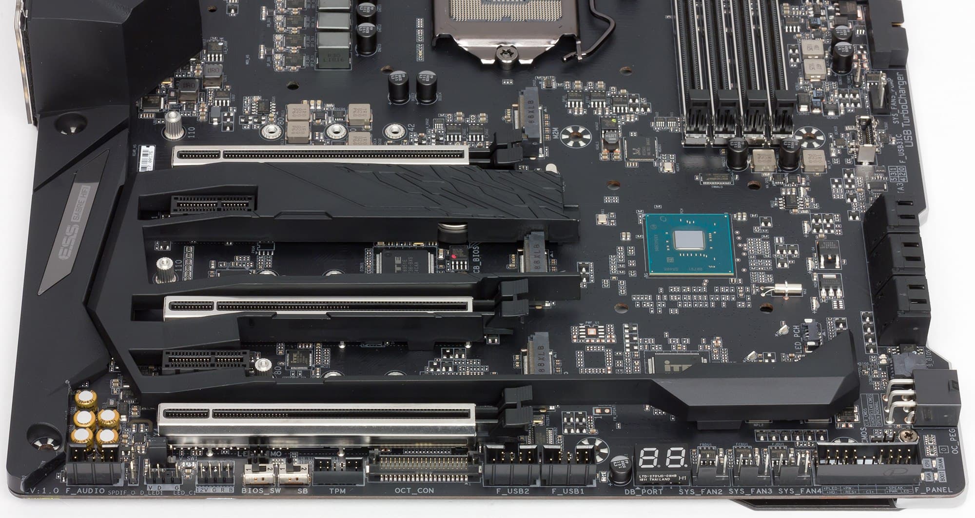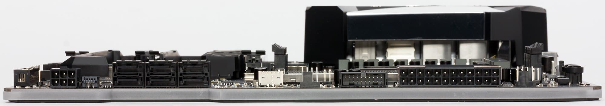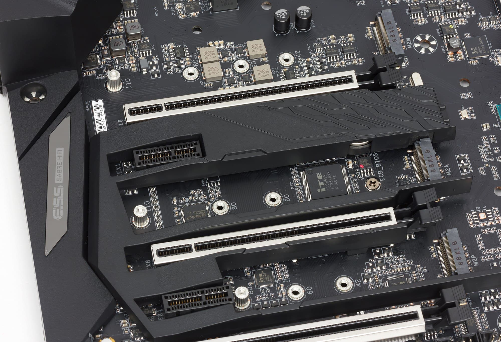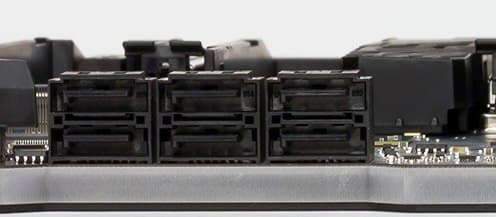 Всего у платы 6 разъемов Serial ATA 6 Гбит/с + 3 слота для накопителей в форм-факторе M.2. (Еще один слот M.2, спрятанный под кожухом блока разъемов задней панели, занят контроллером беспроводных сетей Wi-Fi/Bluetooth.)