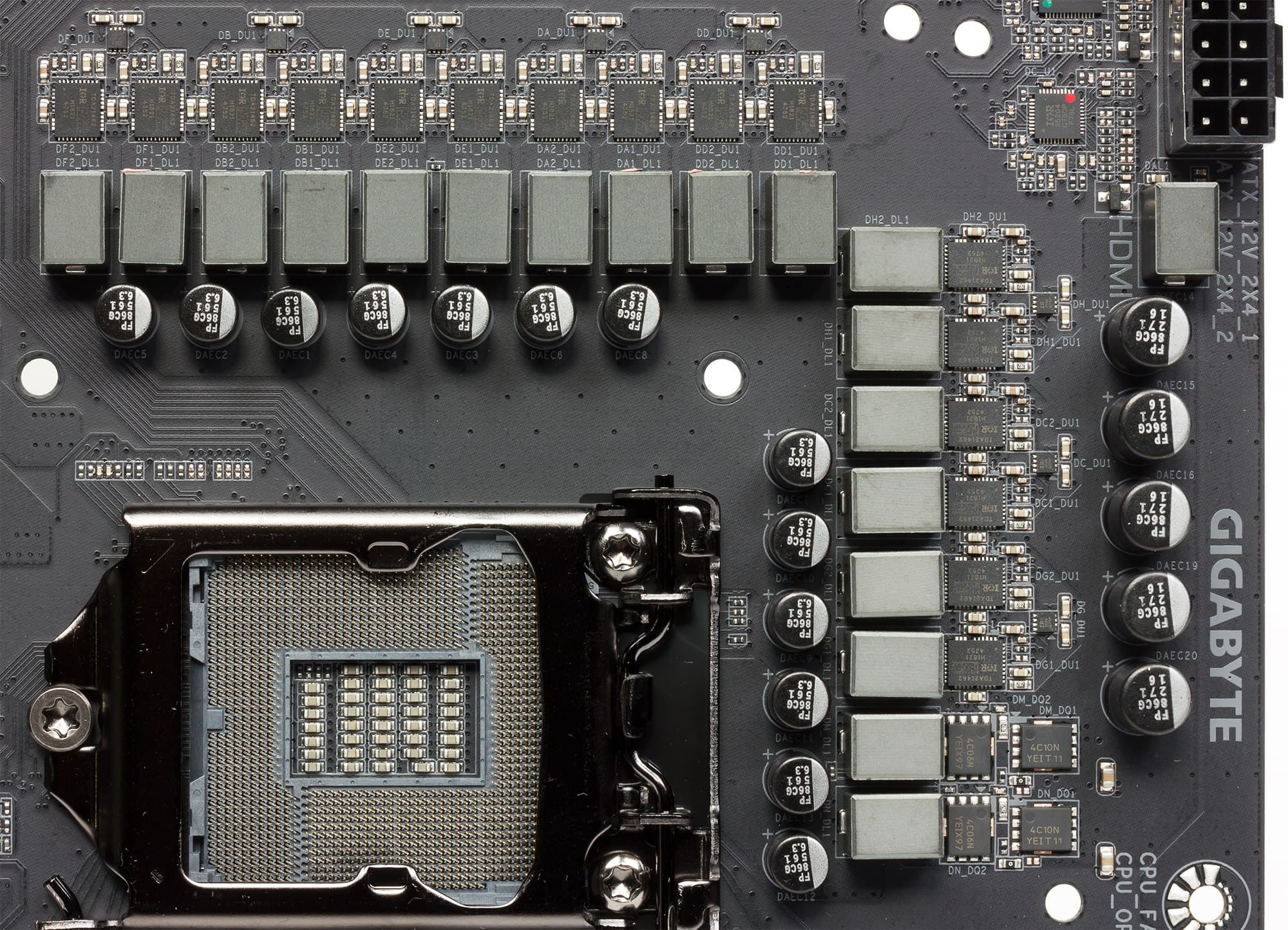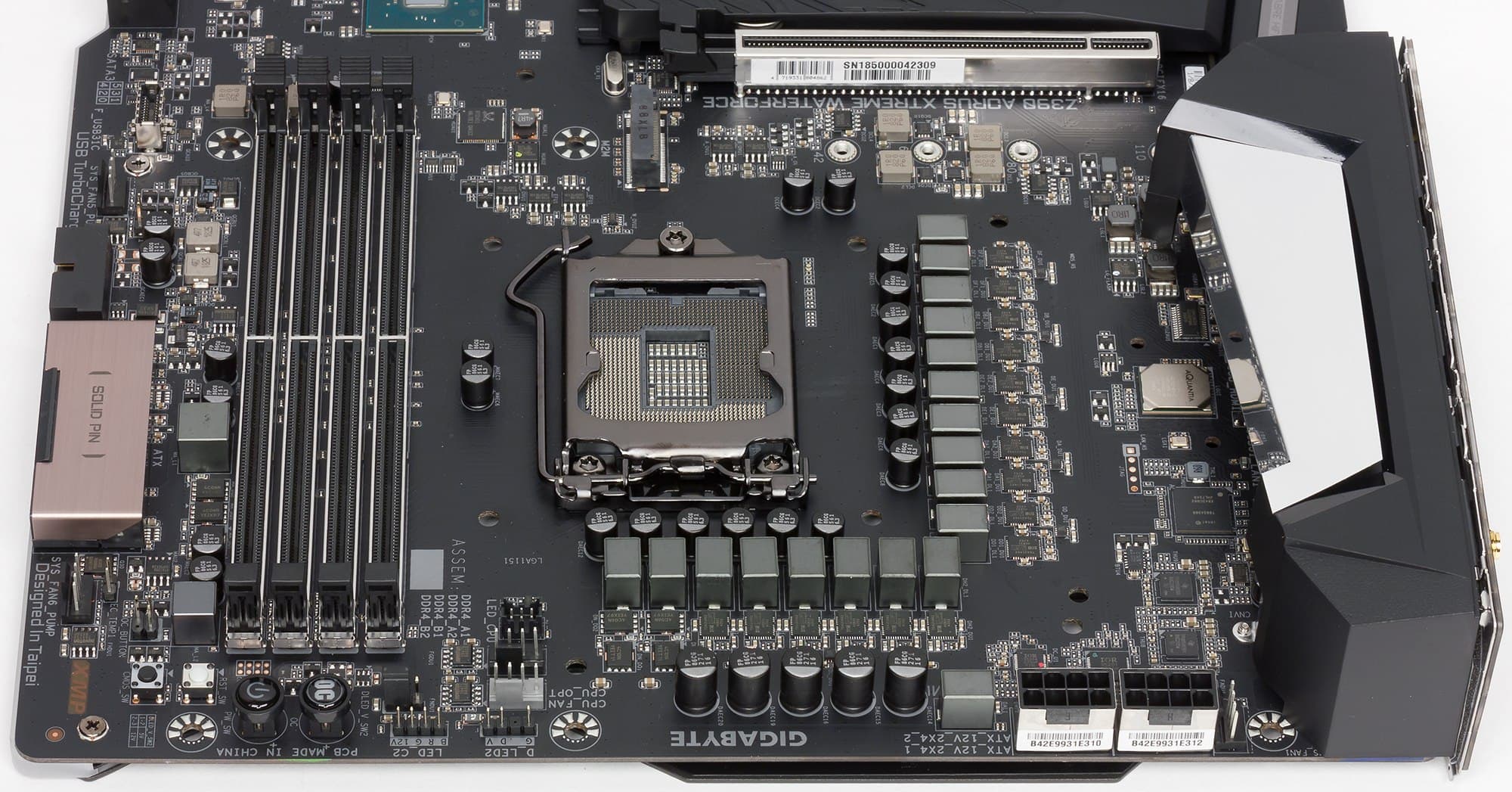 Еще раз надо напомнить, что Gigabyte Z390 Aorus Xtreme WaterForce поддерживает процессоры Intel Core 8-го и 9-го поколений, выполненные под разъем (сокет) LGA1151v2. Хотя физически отличий от старого LGA1151 нет, старые процессоры в LGA1151 v2 работать не будут. Поэтому еще раз напомню: только модели с индексами 8000 и 9000!