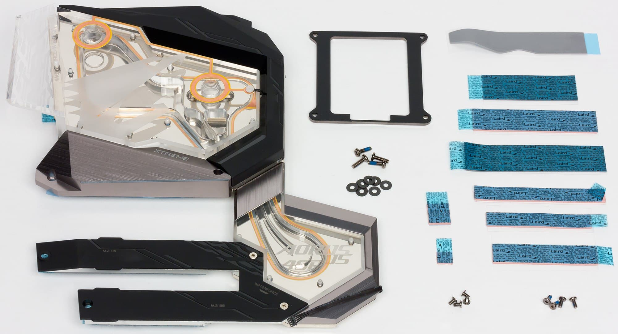 Для всех трех слотов M.2 предусмотрены радиаторы с термоинтефейсом, которые прикрепляются к единому водоблоку, устанавливаемому на плату.