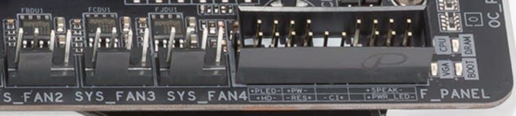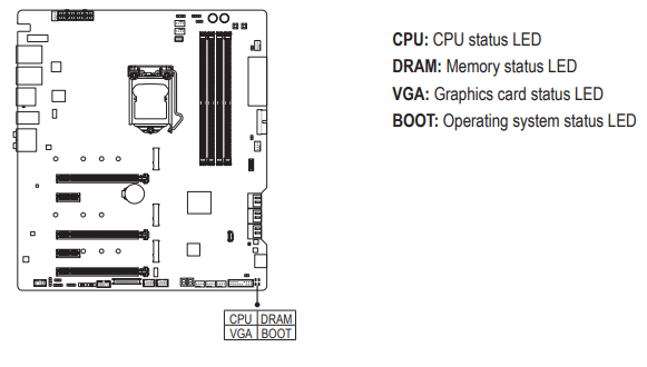 Еще стоит упомянуть о наличии в углу платы световых индикаторов, сообщающих о проблемах с тем или иным компонентом системы. Если после включения компьютера к моменту перехода на загрузку ОС все индикаторы погасли, то проблем нет.