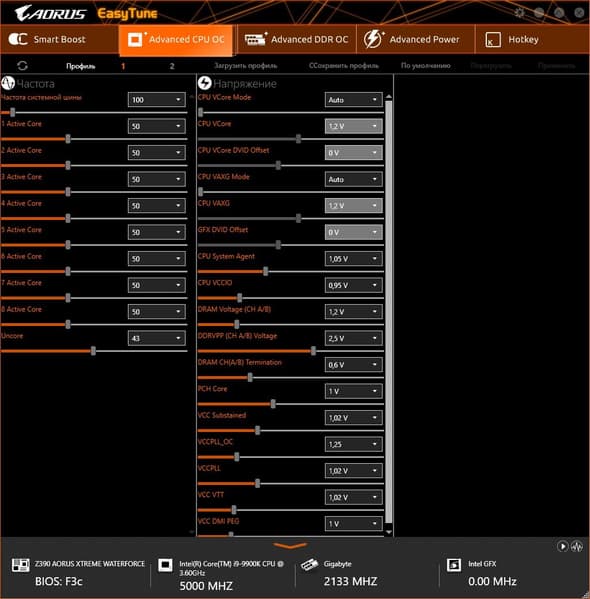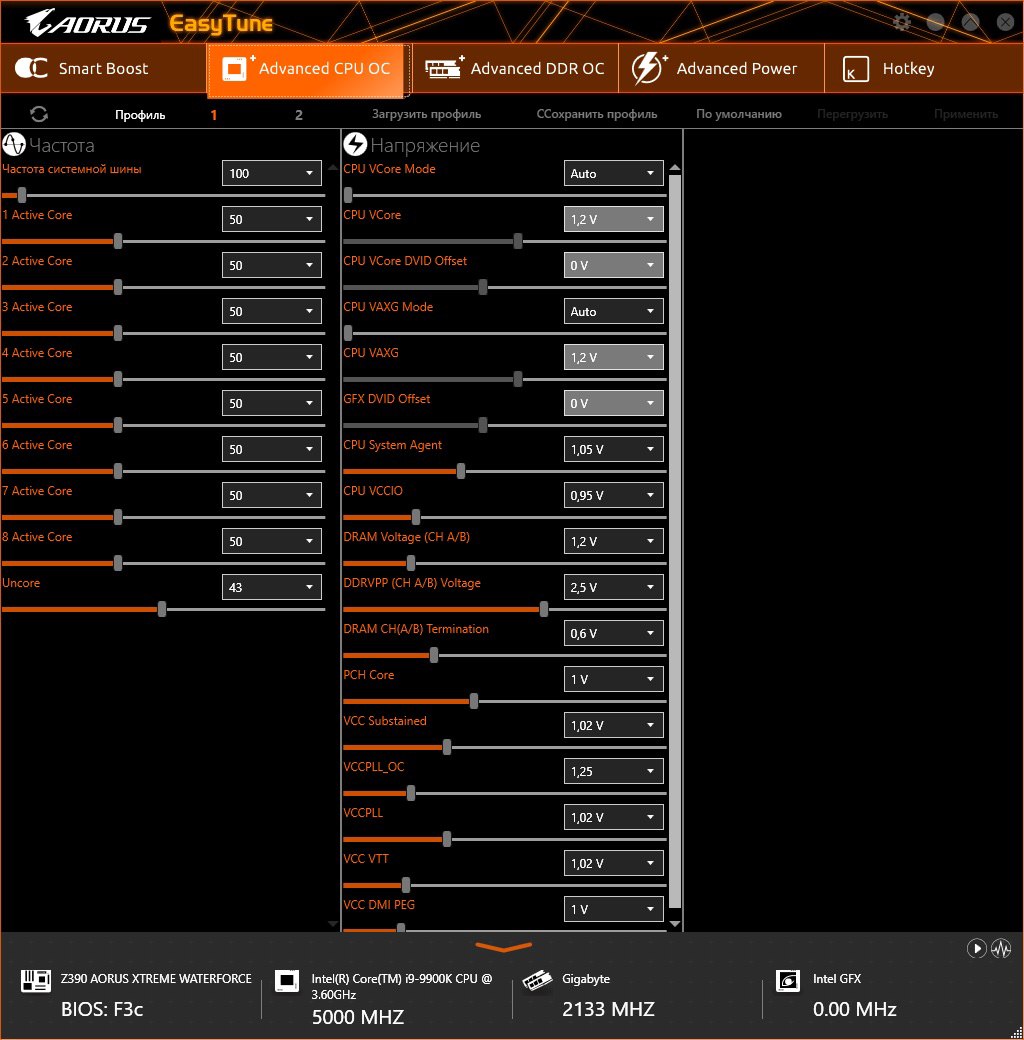 Режим номер 1. Утилитой EasyTune была установлена частота 5,0 ГГц для всех ядер. Unicore-частоту я не трогал, она оставлена на 4,3 ГГц, напряжение ядра было поднято «вилкой» (от 1,25 до 1,42 В):