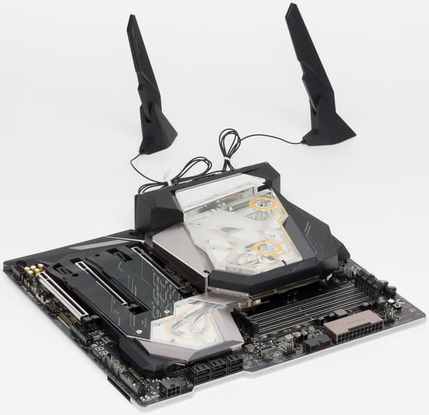 Очень отрадный момент: наконец-то ПО поставляется на флеш-накопителе, а не на CD! Я лично впервые в жизни увидел такое! :) Впрочем, даже если записывать утилиты и прошивки на такие накопители (читаемые на всех без исключения компьютерах), то программное обеспечение за время путешествия платы к покупателю все равно успевает, как правило, устареть, так что все равно придется его обновлять с сайта производителя сразу после покупки. Также в комплекте можно найти традиционные SATA-кабели, винтики для крепления M.2-накопителей, кабели для подключения подсветки водоблока, выносные антенны для беспроводного сетевого адаптера, фирменные стяжки и G-connector (для удобного подключения индикаторов и кнопок на корпусе к материнской плате). При этом «заглушка» на заднюю панель с разъемами уже смонтирована на самой плате.