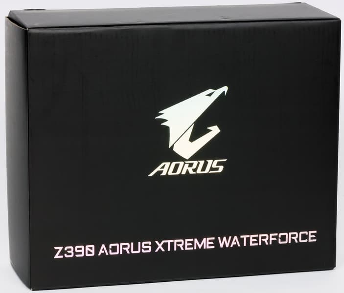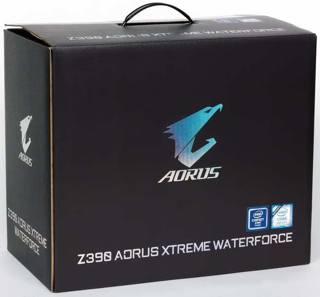 Gigabyte Z390 Aorus Xtreme WaterForce поставляется в большой и очень толстой коробке с ручкой для переноски, выполненной в черно-белых строгих тонах, явно намекающих на принадлежность к премиальному сегменту. Фирменный «сокол» (логотип бренда Aorus) здесь не белый, а переливается всеми цветами радуги. Видимо, это намек на то, что плата имеет богатую RGB-подсветку :) Собственно, об этом вы могли догадаться по ролику в начале статьи.