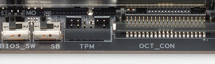 Из особенностей платы еще стоит выделить физические переключатели копий BIOS (то есть имеется дополнительная защита от неудачных прошивок) и разъем TPM для подключения систем обеспечения безопасности.