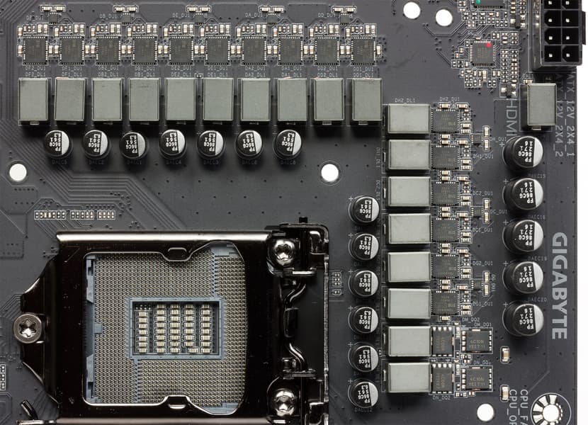 Плата закрыта разного рода накладными (навесными) элементами как с лицевой стороны, так и с обратной. Как и у всех топовых решений Gigabyte, печатная плата соответствует концепции Ultra Durable: имеет медные слои удвоенной толщины, что помогает лучше охлаждать саму PCB, а следовательно, вырастает энергоэффективность.
