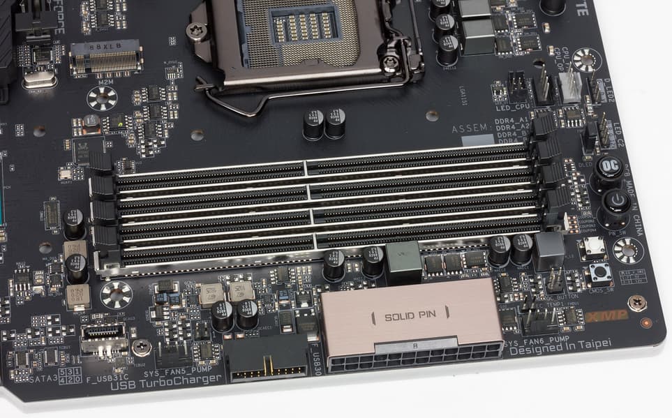 Для установки модулей памяти на плате Gigabyte имеется четыре DIMM-слота (для работы памяти в Dual Channel в случае использования всего 2 модулей их следует устанавливать в А1 и B1 (А2 и В2)). Плата поддерживает небуферизованную память DDR4 (non-EСС), а максимальный объем памяти составляет 64 ГБ (при использовании модулей емкостью по 16 ГБ). Уже появились модули UDIMM на 32 ГБ, и в принципе, никто не мешает набрать ими 128 ГБ ОЗУ. Разумеется, поддерживаются профили XMP.