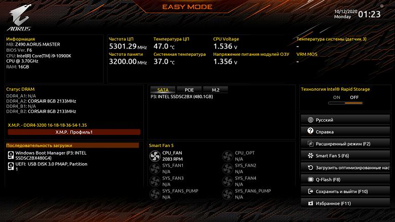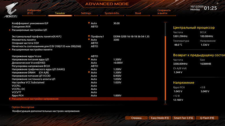 Как и положено флагманам, Gigabyte Z490 Aorus Master предлагает дополнительные возможности для любителей разгона (например, датчики напряжений и температур), много настроек в BIOS и фирменных утилитах и вполне готова обеспечить любой разгон — лишь бы кулер справлялся. Но при этом следует иметь в виду: напряжения надо выставлять вручную!