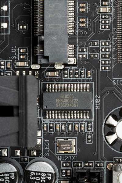 - 8 портов USB 2.0/1.1: 4 реализованы через контроллер Genesys Logic GL850S (на него потрачена 1 линия USB 2.0) и представлены двумя внутренними разъемами (каждый на 2 порта); остальные 4 реализованы через второй Genesys Logic GL850S (на него также потрачена 1 линия USB 2.0) и представлены 4 портами Type-A на задней панели (черные).