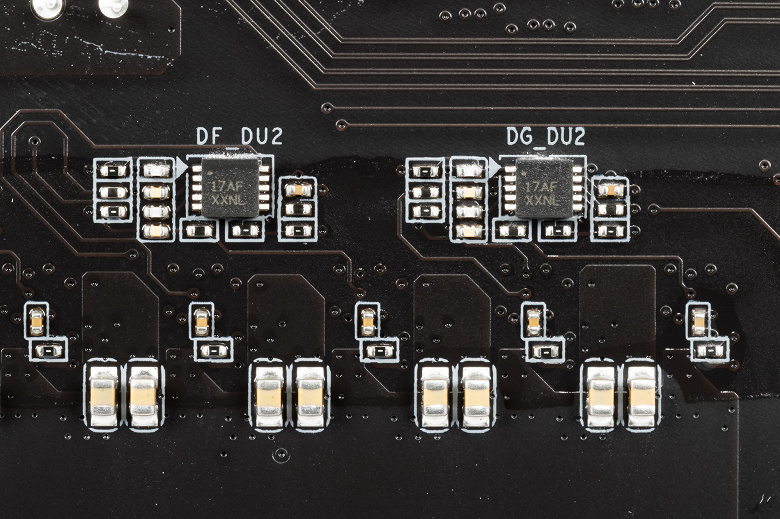 Оборотная сторона — не пустая, там расположены некоторые контроллеры, имеются удвоители фаз питания и прочее. А вот обработан текстолит ну очень хорошо: во всех точках пайки не только острые концы срезаны, но и все гладко отшлифовано. С той же стороны установлена пластина из алюминия с наноуглеродным покрытием. Также пластина помогает отводить тепло от задней стороны PCB через термоинтерфейс и обеспечивает жесткость материнской платы.