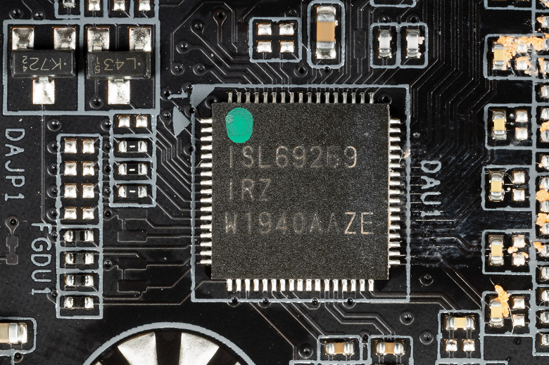 То есть в сумме такая мощнейшая система способна на работу с огромными токами. Управляет схемой ШИМ-контроллер ISL69269 от того же Intersil, рассчитанный максимум на 8 фаз.
