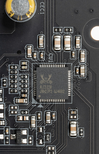 Мы знаем, что практически во всех современных материнских платах звуком заведует аудиокодек Realtek ALC1220. Он обеспечивает вывод звука по схемам до 7.1. В данном случае используется версия Realtek ALC1220-VB.
