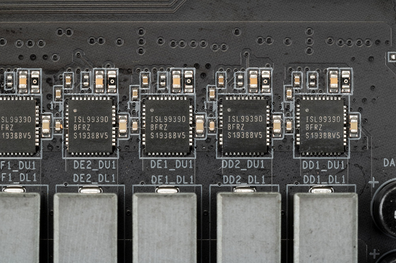 Каждый канал фазы имеет суперферритовый дроссель и ISL99390 MOSFET от Intersil/Renesas на 90 А.