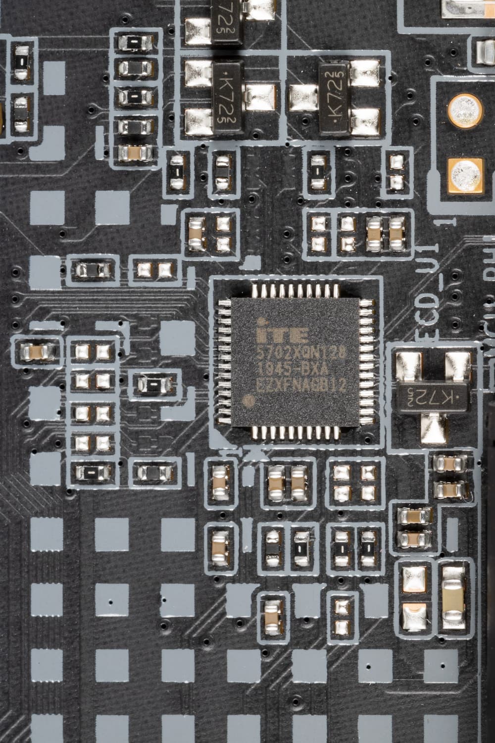 На оборотной стороне элементов не имеется, есть лишь мелкая логика. Обработан текстолит очень хорошо: во всех точках пайки острые концы срезаны и обработаны.