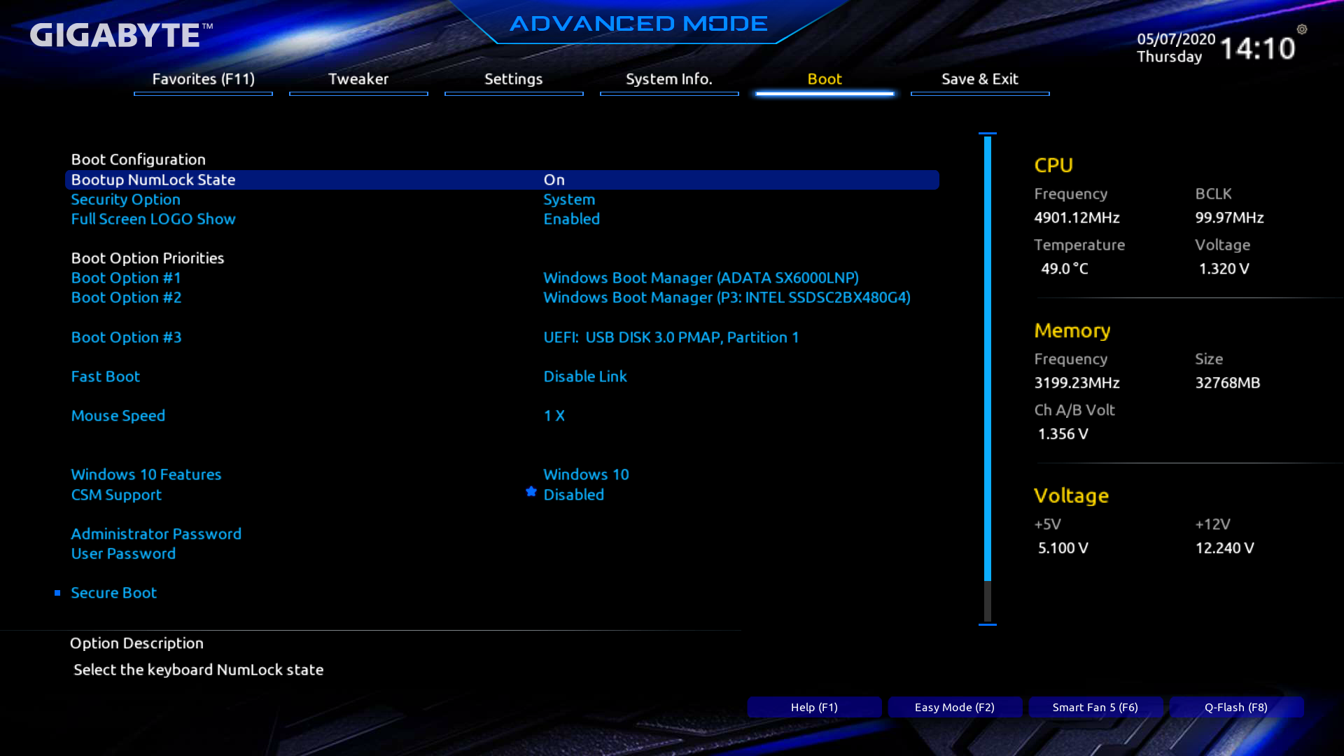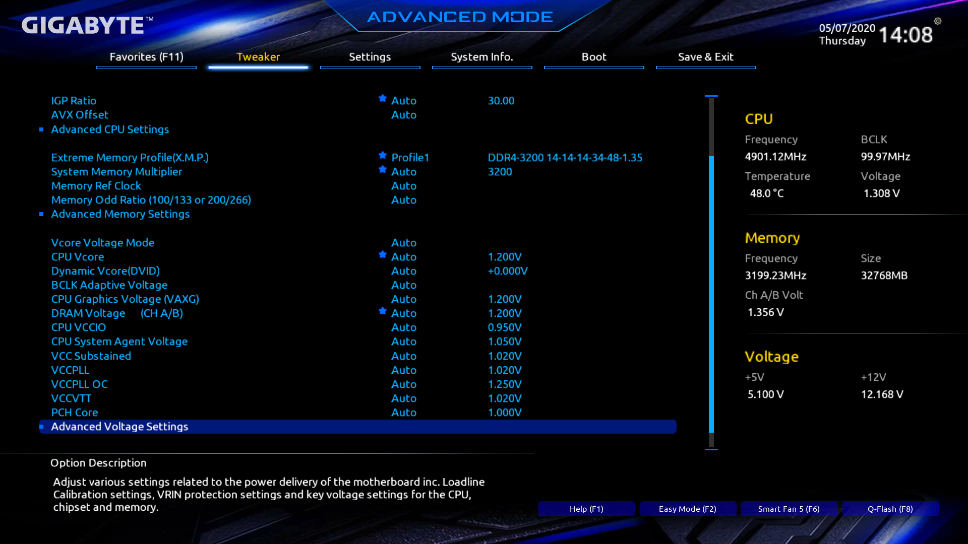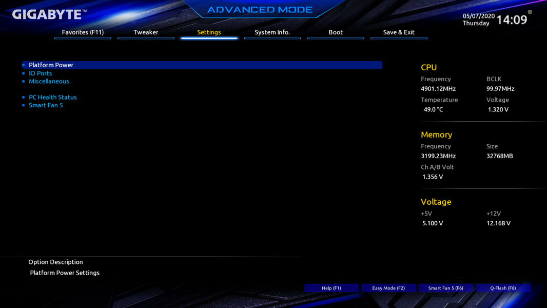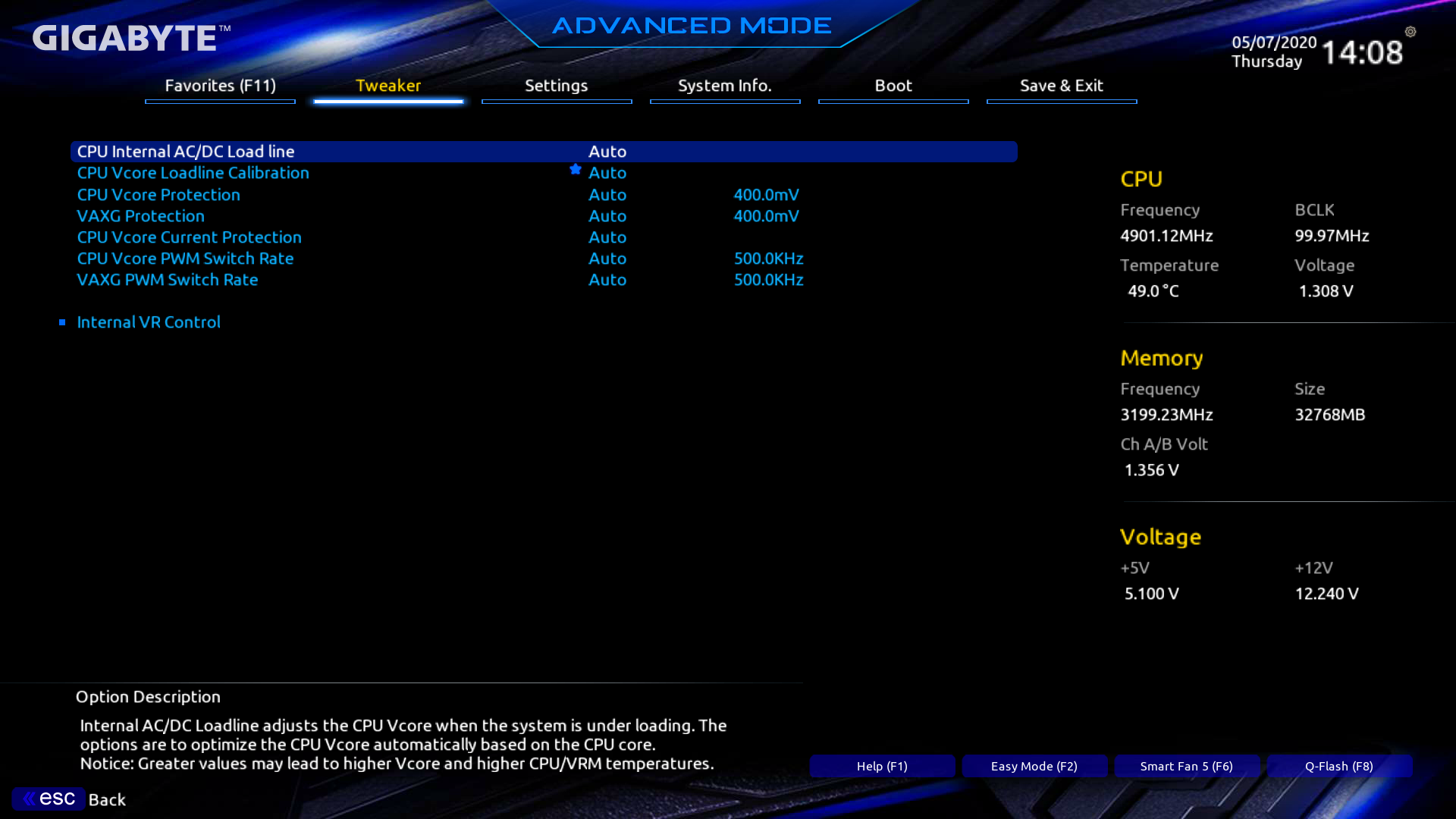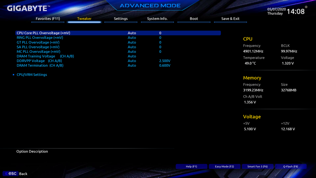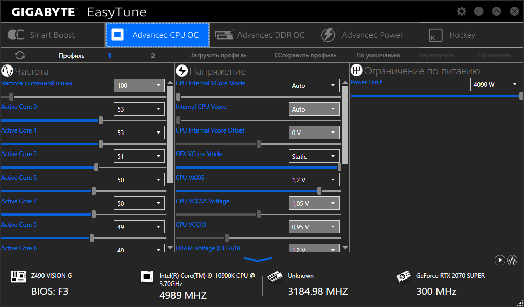 Далее я пробовал выставить 5,2 ГГц по всем ядрам — зависло, даже 5,0 ГГц давали нестабильную работу системы. Только 4,9 ГГц по всем ядрам выдали нормальную стабильность.