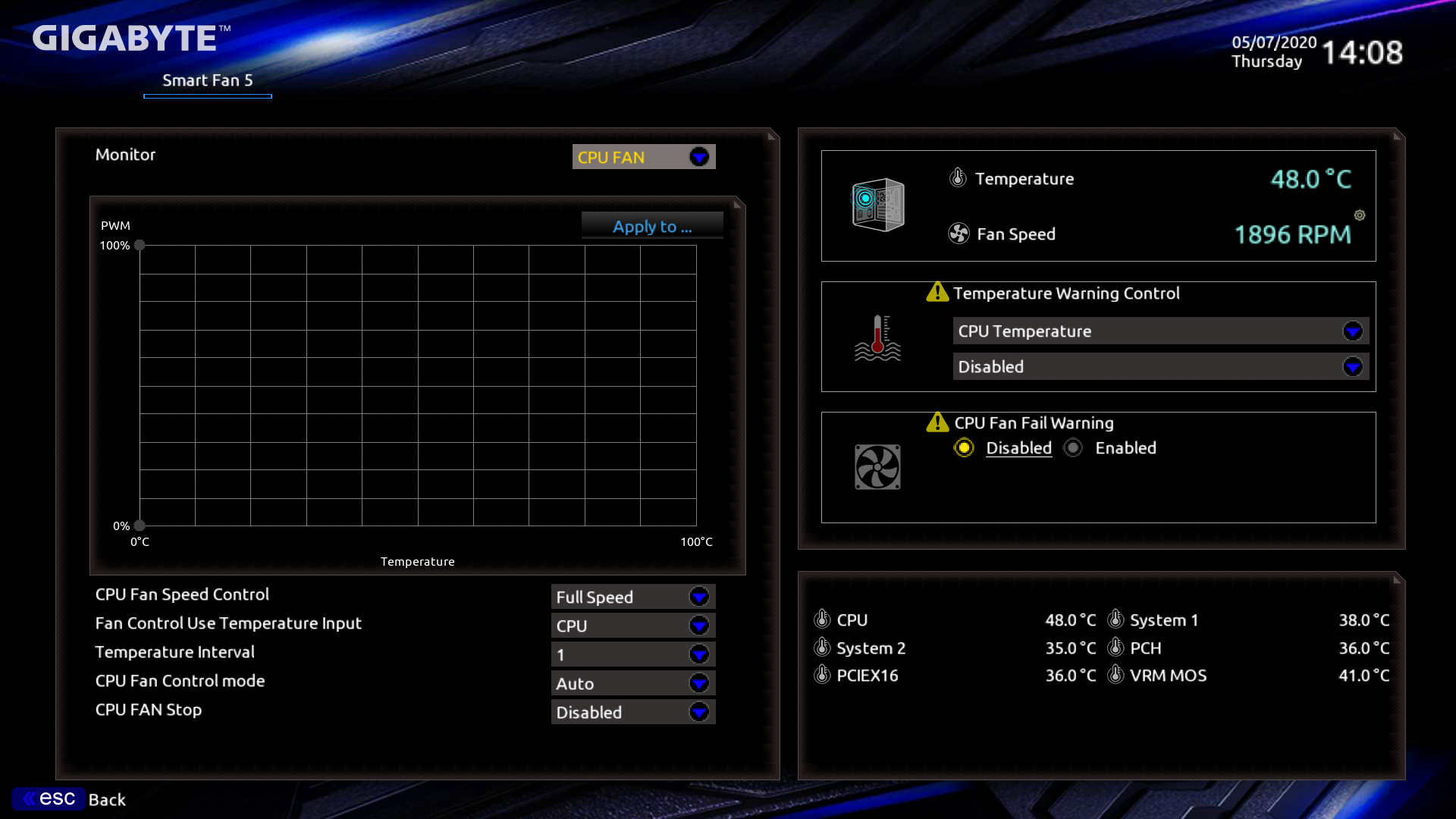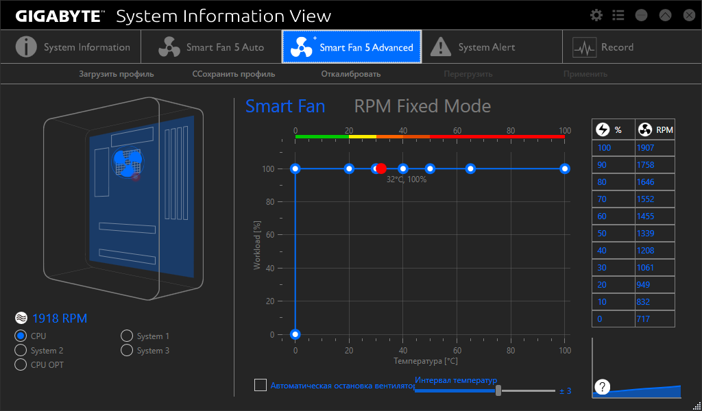 Понятно, что на этой вкладке мы выбираем режимы, исходя из шумовых характеристик. Режимы «умные», то есть если вы выбрали, например, «тихий» режим, то частота вращения вентиляторов будет поддерживаться на минимальном уровне до тех пор, пока это возможно из-за нагрева процессора/платы (мы помним, что плата оснащена массой термодатчиков), затем сформируется сигнал для снижения частот в рамках Turbo Boost.