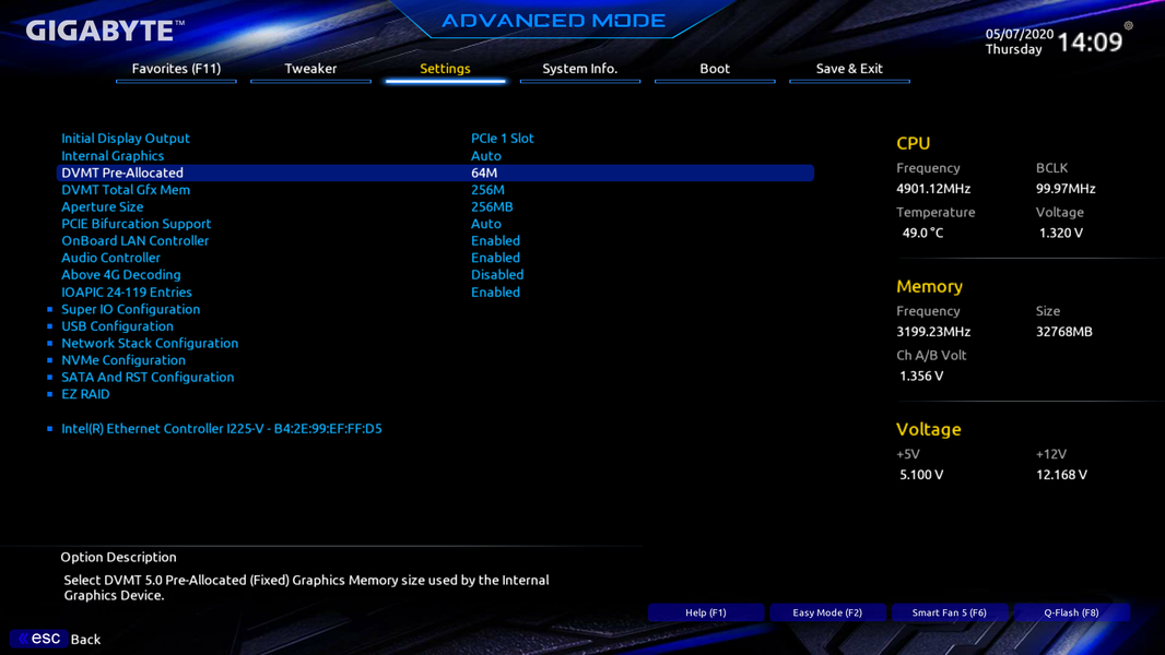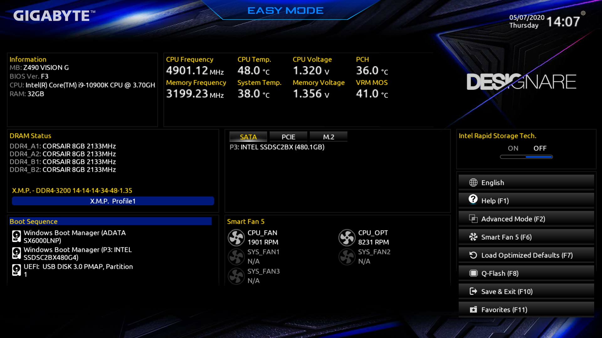 Попадаем в общее «простое» меню, где по сути одна информация (с легким выбором ряда опций), так что нажимаем F7 и попадаем уже в «продвинутое» меню. Забавно, что в дизайне меню UEFI еще не успели заменить «Designare» на новое название серии.