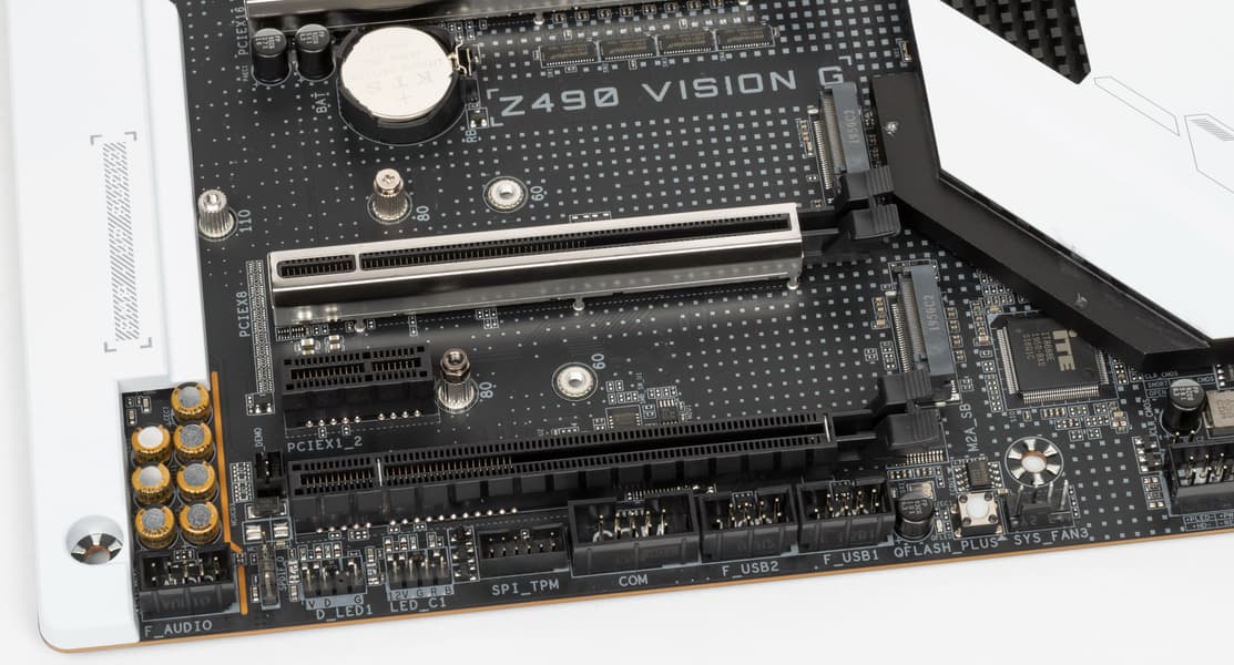 Форм-фактор ATX имеет размеры до 305×244 мм, а E-ATX — до 305×330 мм. Материнская плата Gigabyte Z490 Vision G имеет размеры 305×244 мм, поэтому выполнена в форм-факторе ATX, и на ней имеются 9 монтажных отверстий для установки в корпус.