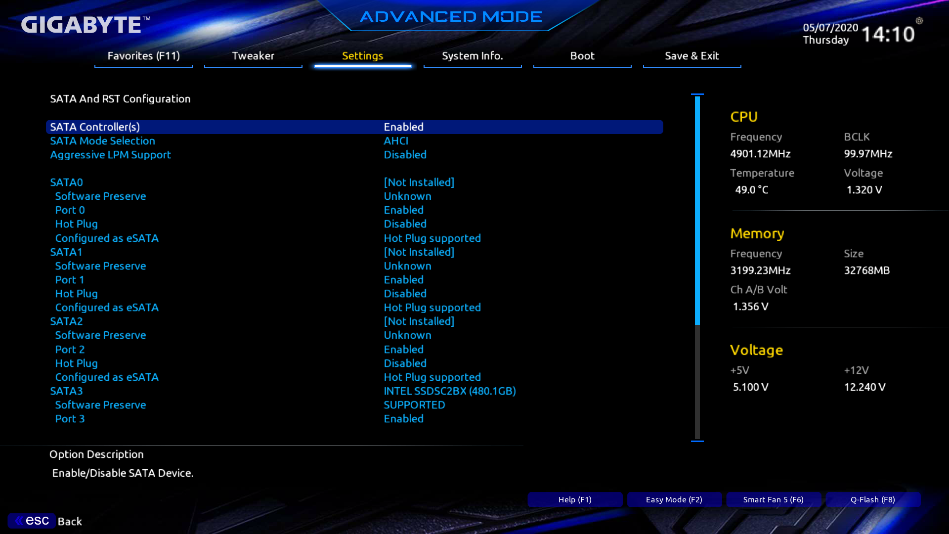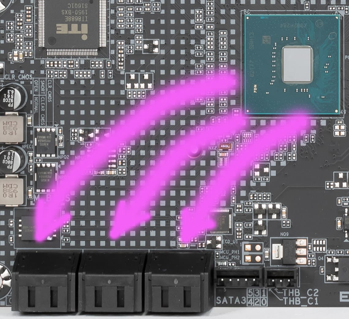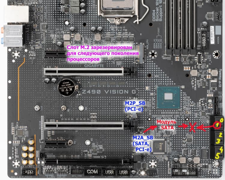 Поскольку количество HSIO линий у Z490 ограничено тридцатью, то приходится делить ресурсы, о чем я выше уже говорил, рассматривая PCIe слоты. А также если в слот M.2 (M2A_SB) вставлен накопитель с интерфейсом SATA, то это автоматом отключит порт SATA_1 (ну и наоборот, если последний задействован, то слот M.2 (M2A_SB) будет работать только в режиме PCIe x4/x2).