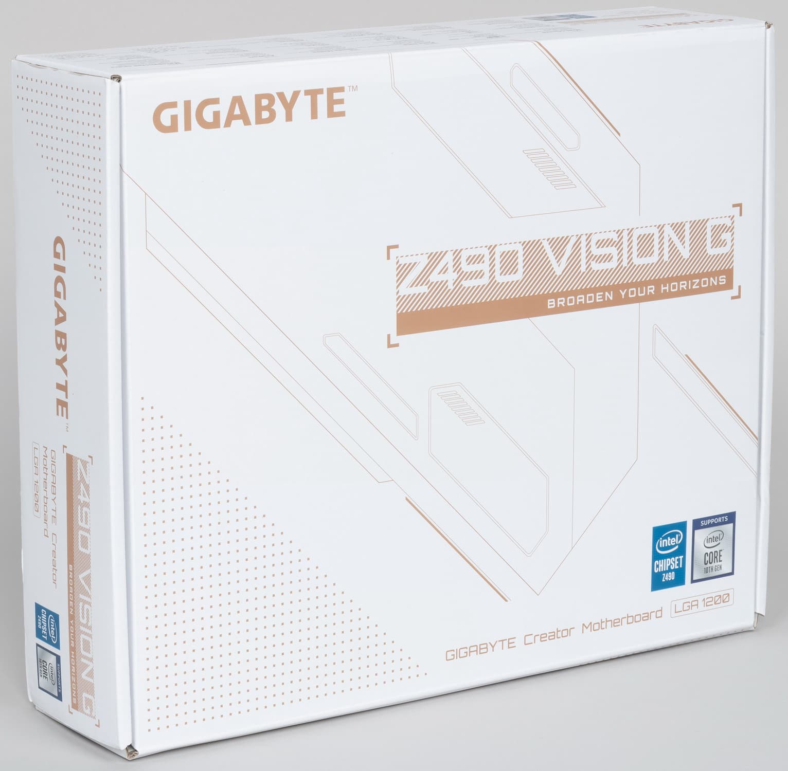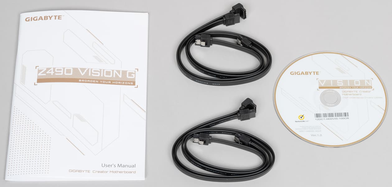 Gigabyte Z490 Vision G поставляется в обычной коробке с весьма скромным дизайном (собственно позиционирование платы написано внизу — для создателей чего-либо). Внутри коробки есть два отсека: для самой материнской платы и остального комплекта.