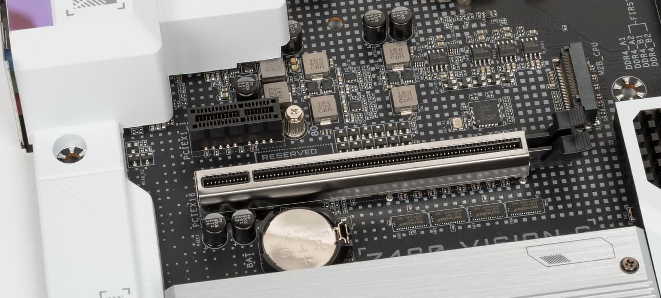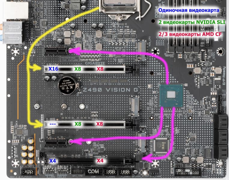 Всего на плате есть 5 слотов PCIe: три PCIe x16 (для видеокарт или других устройств) и два «коротких» PCIe x1. Если про первые два PCIe x16 я выше уже рассказал (они подключены к CPU), то третий PCIe x16_3 подключен к Z490. Как и два PCIe x1 также получают данные от чипсета.