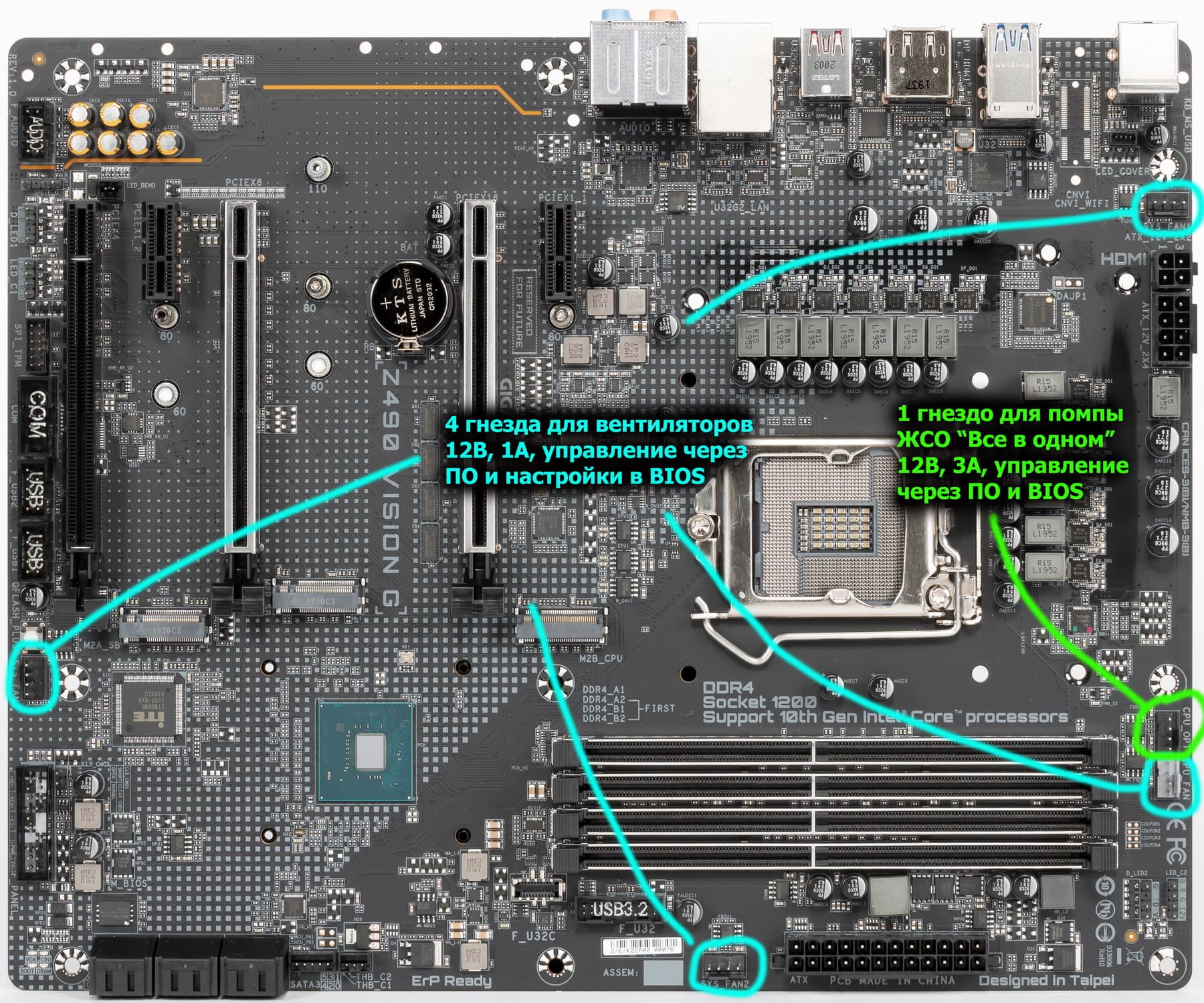 Теперь про блок ввода-вывода, разъемы для подключения вентиляторов и т. п. Разъемов для подключения вентиляторов и помп — 5. Схема размещения коннекторов для систем охлаждения выглядит так: