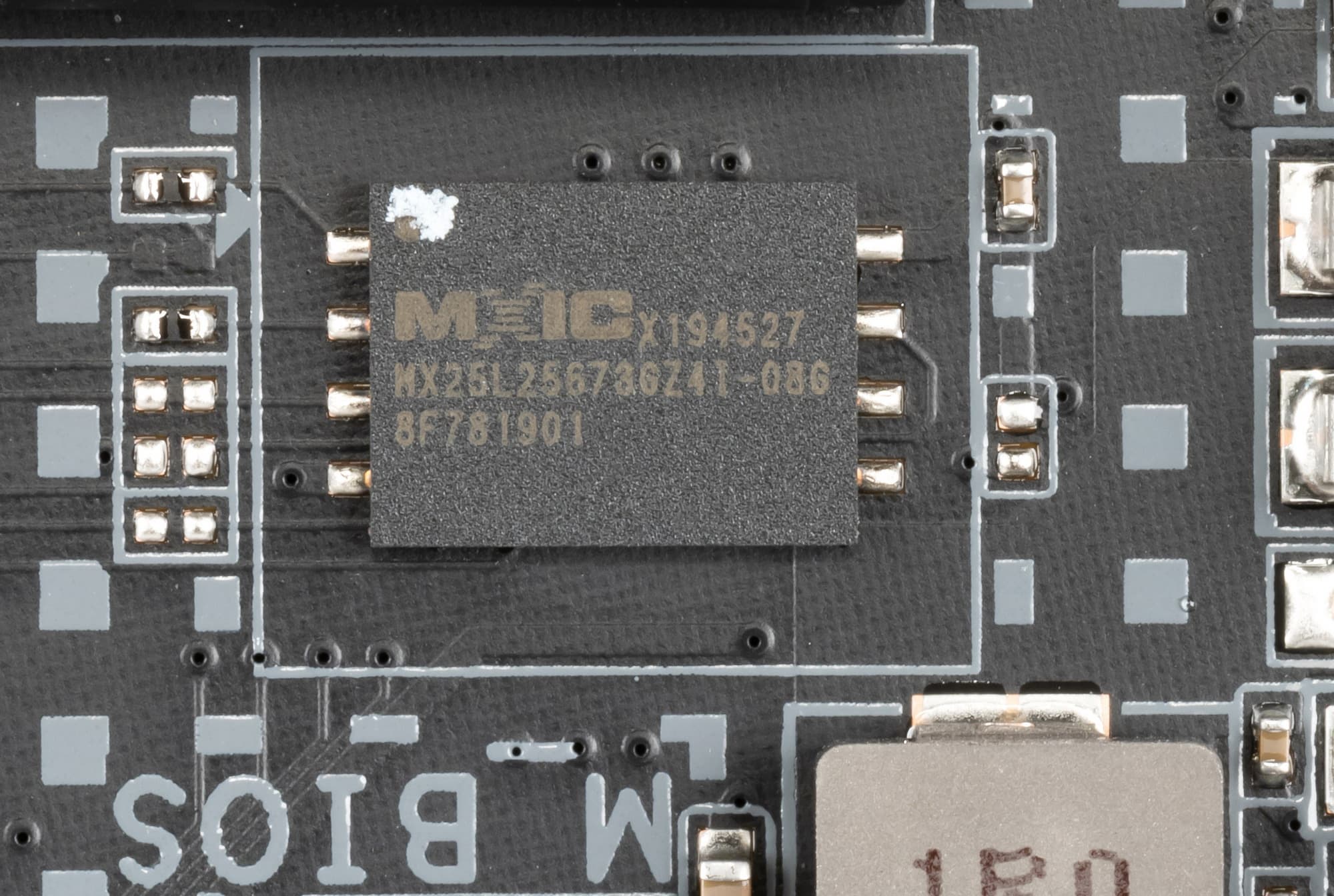 Для размещения прошивки UEFI/BIOS использована микросхема MXIC MX25L25673GZ4I от Macronix.