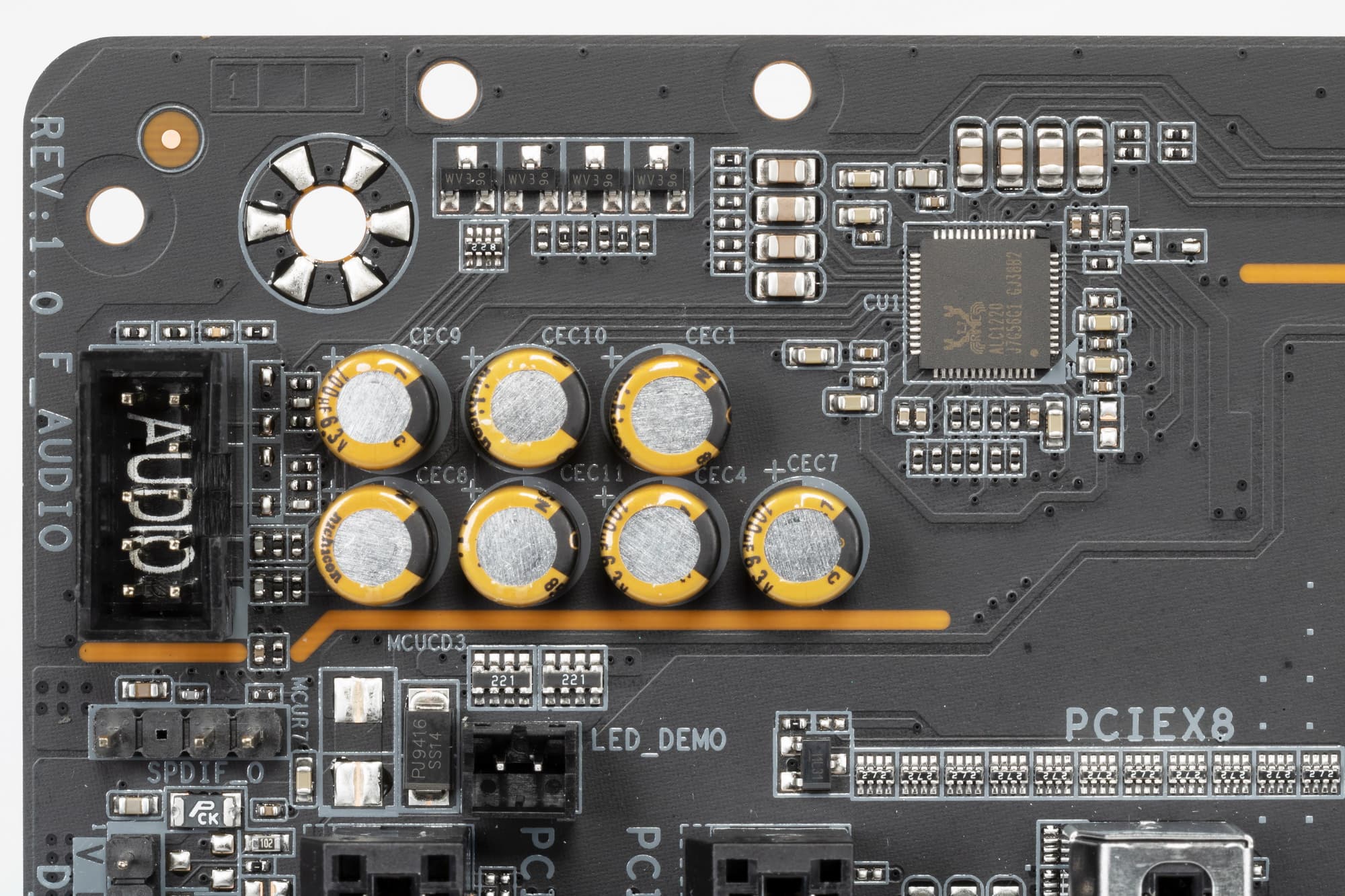 Аудиотракт вынесен на угловую часть платы, не пересекается с другими элементами. Разумеется, левый и правый каналы разведены по разным слоям печатной платы. Все аудиоразъемы на задней панели имеют привычную цветовую окраска разъемов.