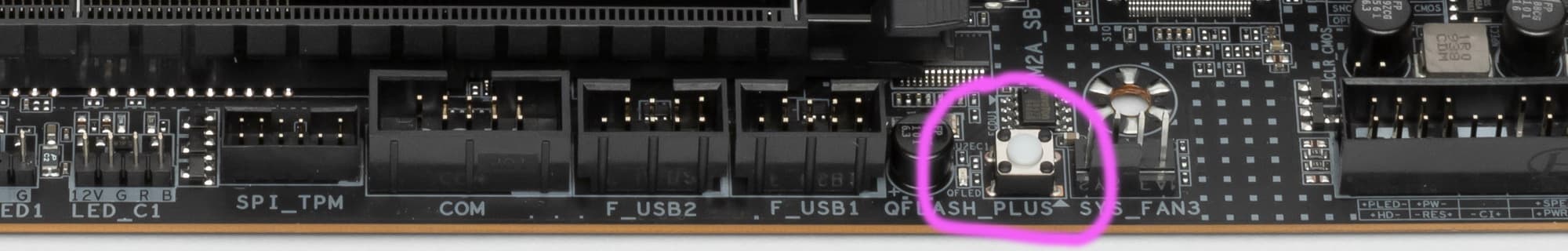 Q-Flash Plus не требует наличия ОЗУ, процессора и прочей периферии, нужно лишь подключить кабели питания. Для такого обновления BIOS версию прошивки надо вначале записать в корень на USB-«флешку» (размеченную в FAT32), которая вставляется в особо отмеченный порт USB. Ну и запуск через кнопку, которую надо держать 3 секунды. Заведует работой Q-Flash Plus контроллер ITE IT5702.