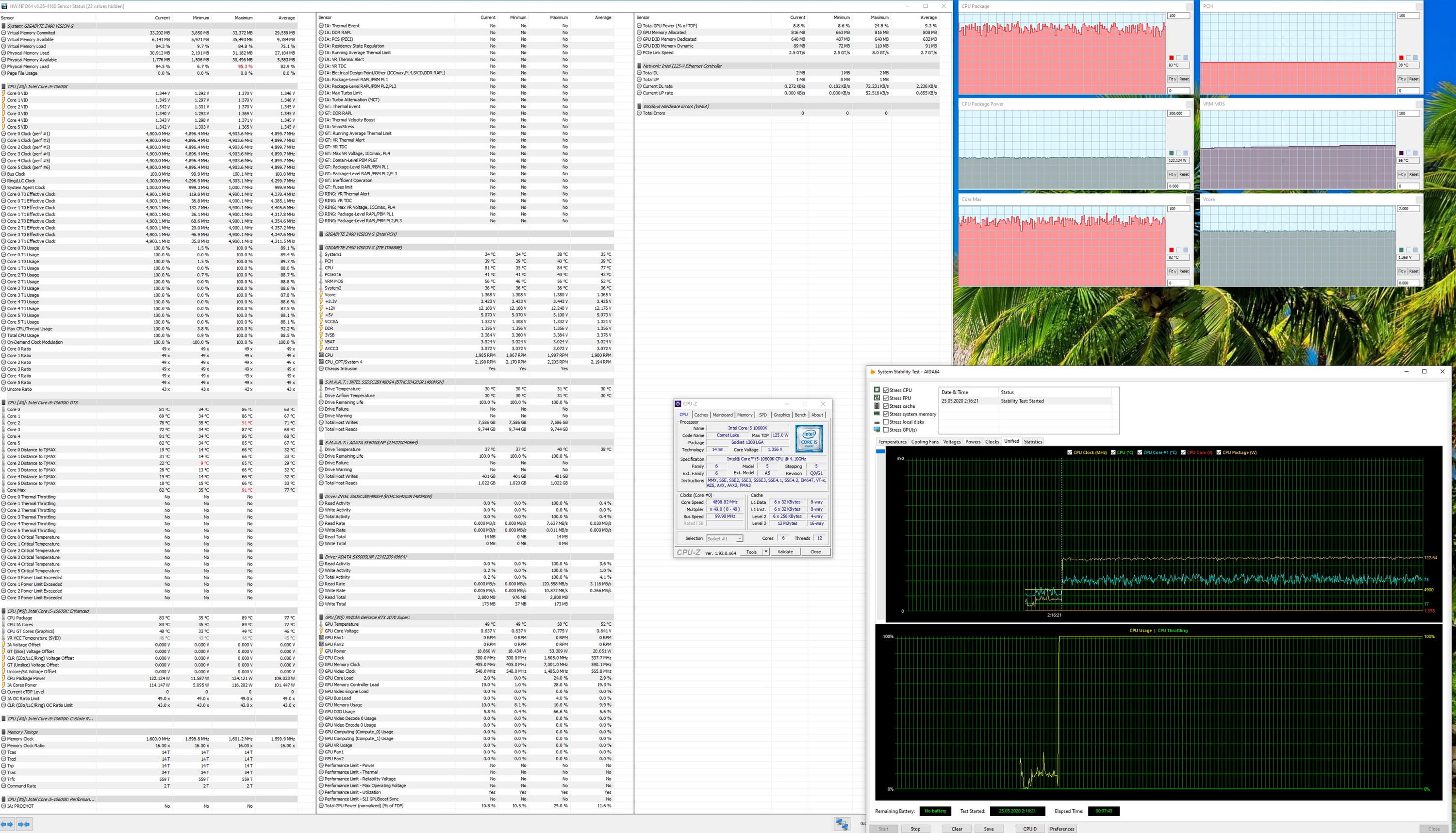 Несмотря на приличную систему питания, плюс включенный MCE, Intel TurboBoost поднял частоты всех ядер до всего до 4,5 ГГц (это-то с 4,1 по умолчанию!). Негусто... Температурные параметры у всех элементов матплаты — в норме (блок VRM и чипсет Z490 не нагревались выше 45 °C). Процессор выше 66 °C не нагревался. Помним, что TurboBoost «щупает» системы питания и охлаждения и ставит частоты, исходя из этих рамок. Почему при таком слабом нагреве процессора не были выставлены более высокие частоты — понятно, матплата все же не для разгонов.