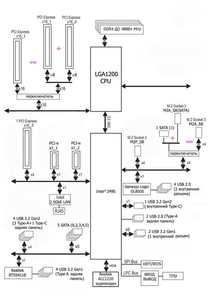 Процессоры Intel Core 10-го поколения (совместимые с сокетом LGA1200 и поддерживаемые Z490) имеют 16 линий ввода-вывода (включая PCIe 3.0), не имеют USB и SATA портов. При этом взаимодействие с Z490 идет по особому каналу Digital Media Interface 3.0 (DMI 3.0), и линии PCIe на это не расходуются. Все PCIe линии процессора идут на слоты расширения PCIe. Serial Peripheral Interface (SPI) используется для взаимодействия с системой UEFI/BIOS, а шина Low Pin Count (LPC) — для связи с устройствами ввода/вывода, не требующими высокой пропускной способности (контроллерами вентиляторов, TPM, старой периферии).