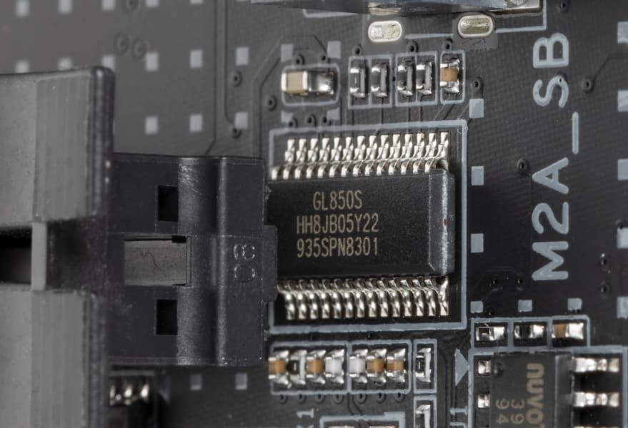 - 6 портов USB 2.0/1.1: 4 реализованы через контроллер Genesys Logic GL850S (на него потрачена 1 линия PCIe) и представлены двумя внутренними разъемами (каждый на 2 порта); еще 2 реализованы через Z490 и представлены портами Type-A на задней панели (черные).