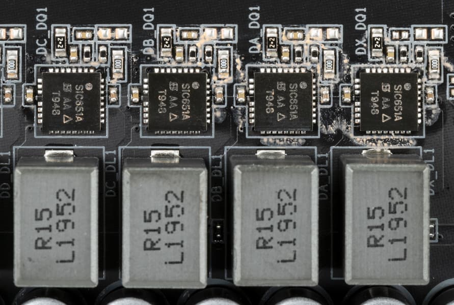 Каждый канал фазы имеет суперферритовый дроссель и SiC651A MOSFET от Vishay Siliconix на 50 А.