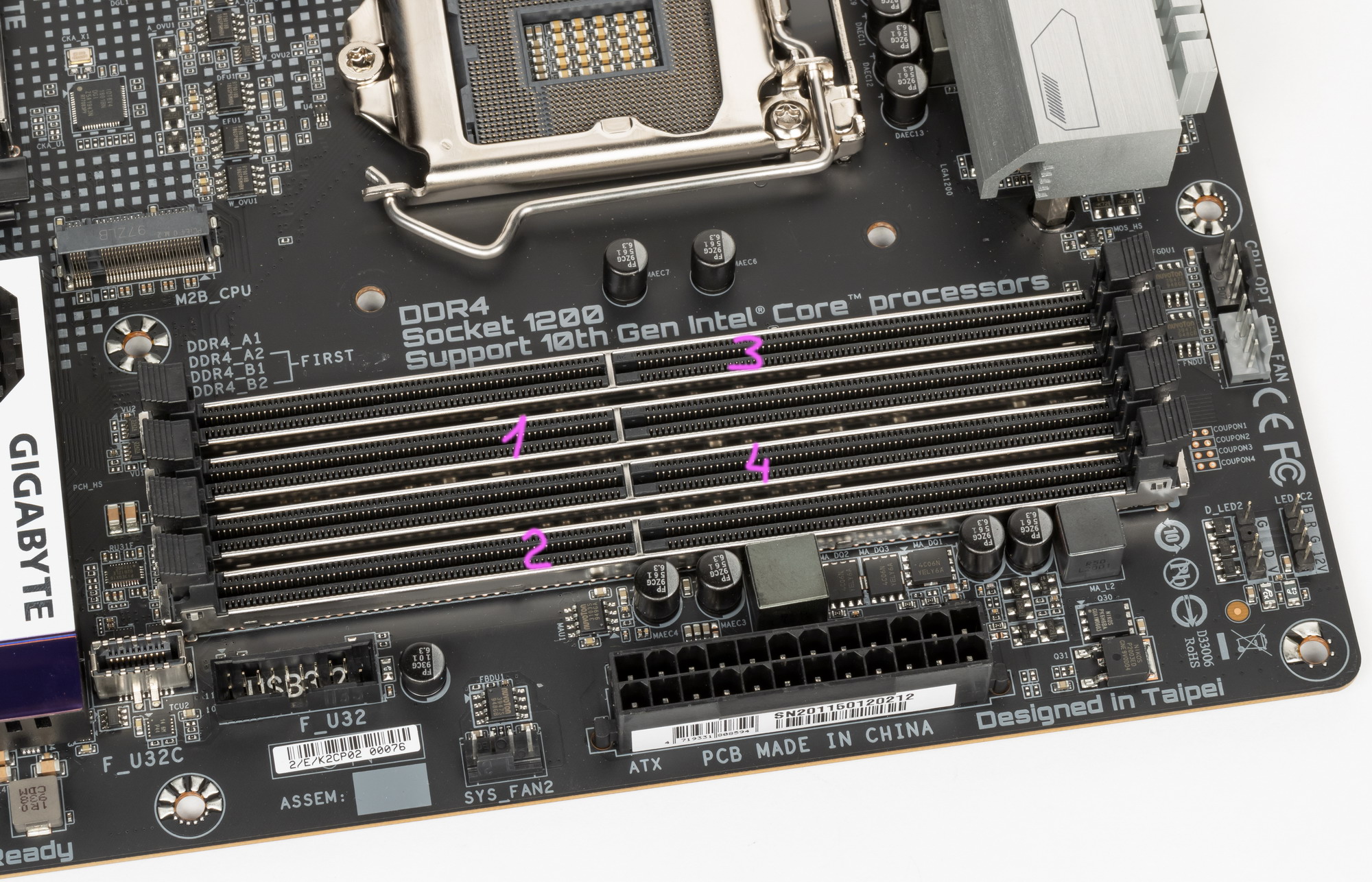 Для установки модулей памяти на плате Gigabyte имеется четыре DIMM-слота (для работы памяти в Dual Channel в случае использования всего 2 модулей их следует устанавливать в А2 и B2. Плата поддерживает небуферизованную память DDR4 (non-EСС), а максимальный объем памяти составляет 128 ГБ (при использовании UDIMM последнего поколения по 32 ГБ). Разумеется, поддерживаются профили XMP.