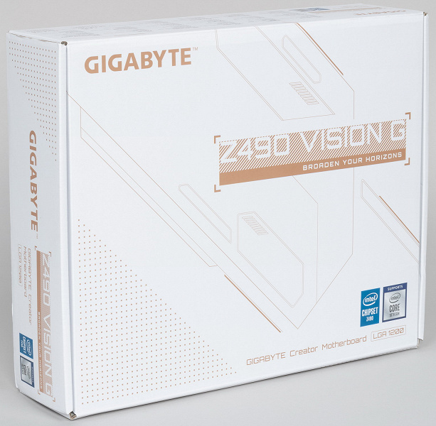 Третьей из всех материнок на Z490 нам попала матплата из серии Vision компании Gigabyte. Конечно же, это явно не геймерский продукт. Материнская плата Gigabyte Z490 Vision G на момент написания материала еще не была в продаже, ее ценник — ориентировочно около 17 — 20 тысяч рублей (из-за постоянно меняющегося курса рубля трудно дать более четкие рамки цен).