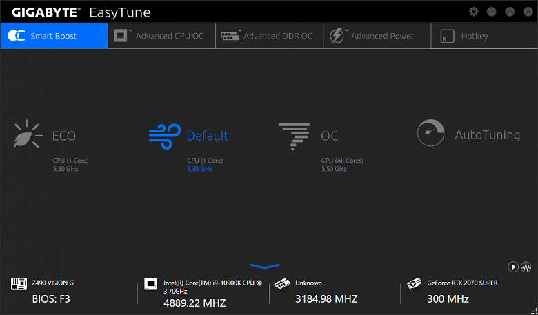 Стартовая вкладка EasyTune — это для тех, кому неохота влезать в тонкости разгона. Здесь можно просто выбрать режим, чтобы система сама выставила все частоты и напряжения. В процессорах Intel работает технология Turbo Boost, которая позволяет автоматически поднимать частоту работы ядер до определенных максимумов в пределах теплопакета и температуры конкретной модели процессора. Обратили внимание на то, что все же тема разгона присутствует? :)