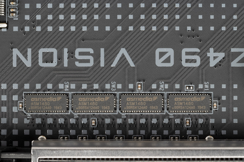У данной платы перераспределение линий PCIe между слотами в случае использования более одной видеокарты, поэтому востребованы мультиплексоры ASM1480 от ASMedia.
