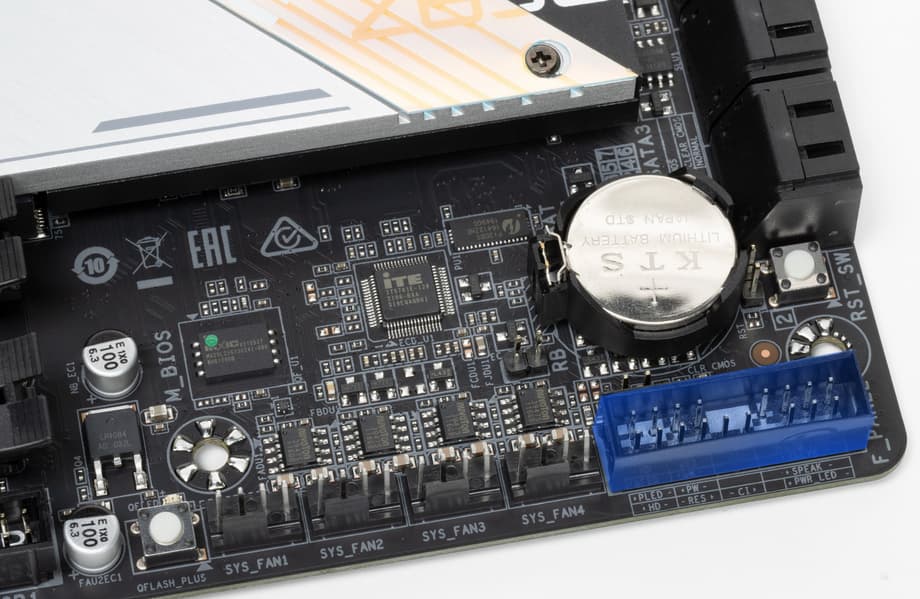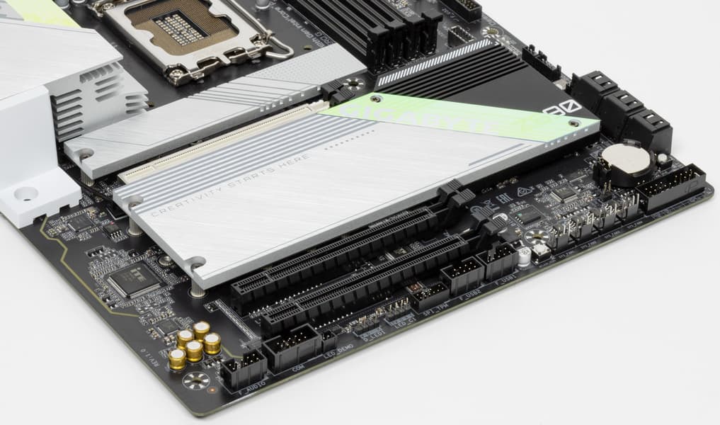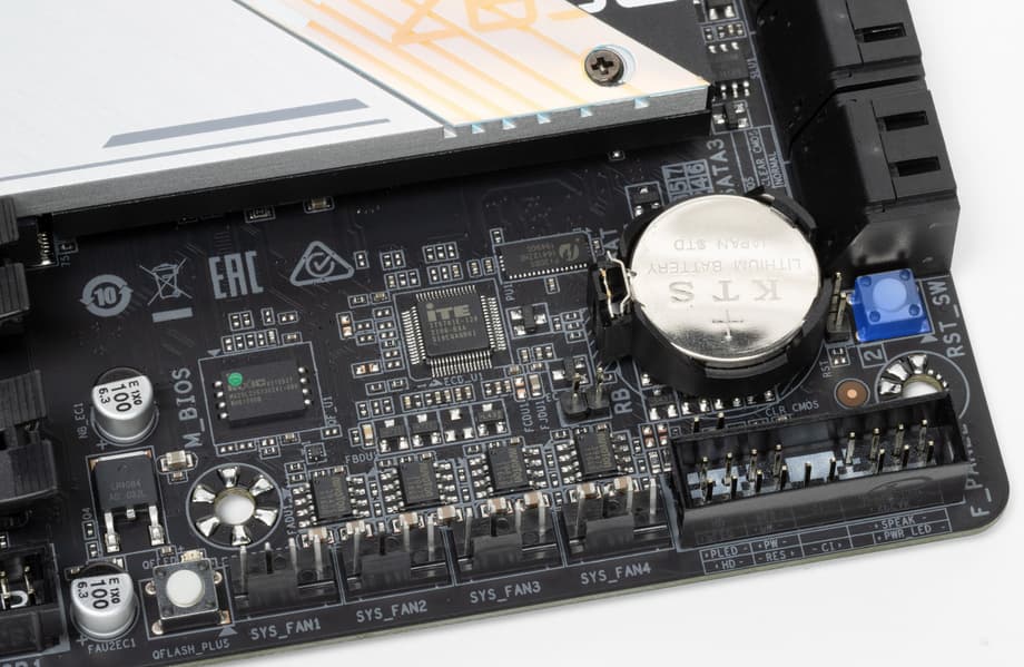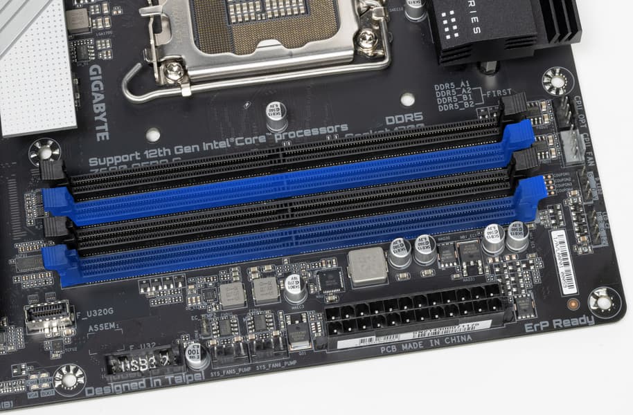 Для установки модулей памяти на плате Gigabyte имеется четыре DIMM-слота (для работы памяти в Dual Channel в случае использования всего 2 модулей их следует устанавливать в А2 и B2 (отмечены синим цветом). Плата поддерживает небуферизованную память DDR5 (non-EСС), а максимальный объем памяти составляет 128 ГБ. Разумеется, поддерживаются профили XMP.