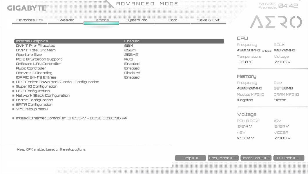| Сетевые контроллеры | 1 × Intel I225-V Ethernet 2,5 Гбит/с 1 × Intel Dual Band Wireless AX201NGW (Wi-Fi 802.11a/b/g/n/ac/ax (2,4/5 ГГц) + Bluetooth 5.2) |