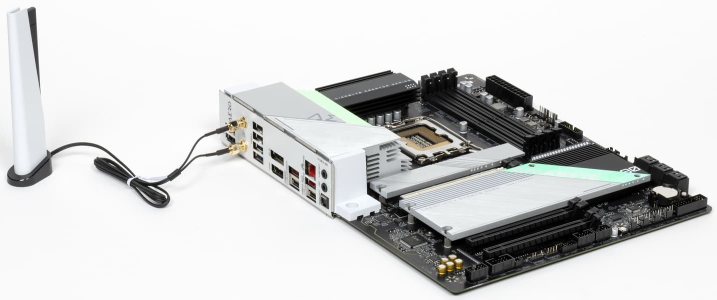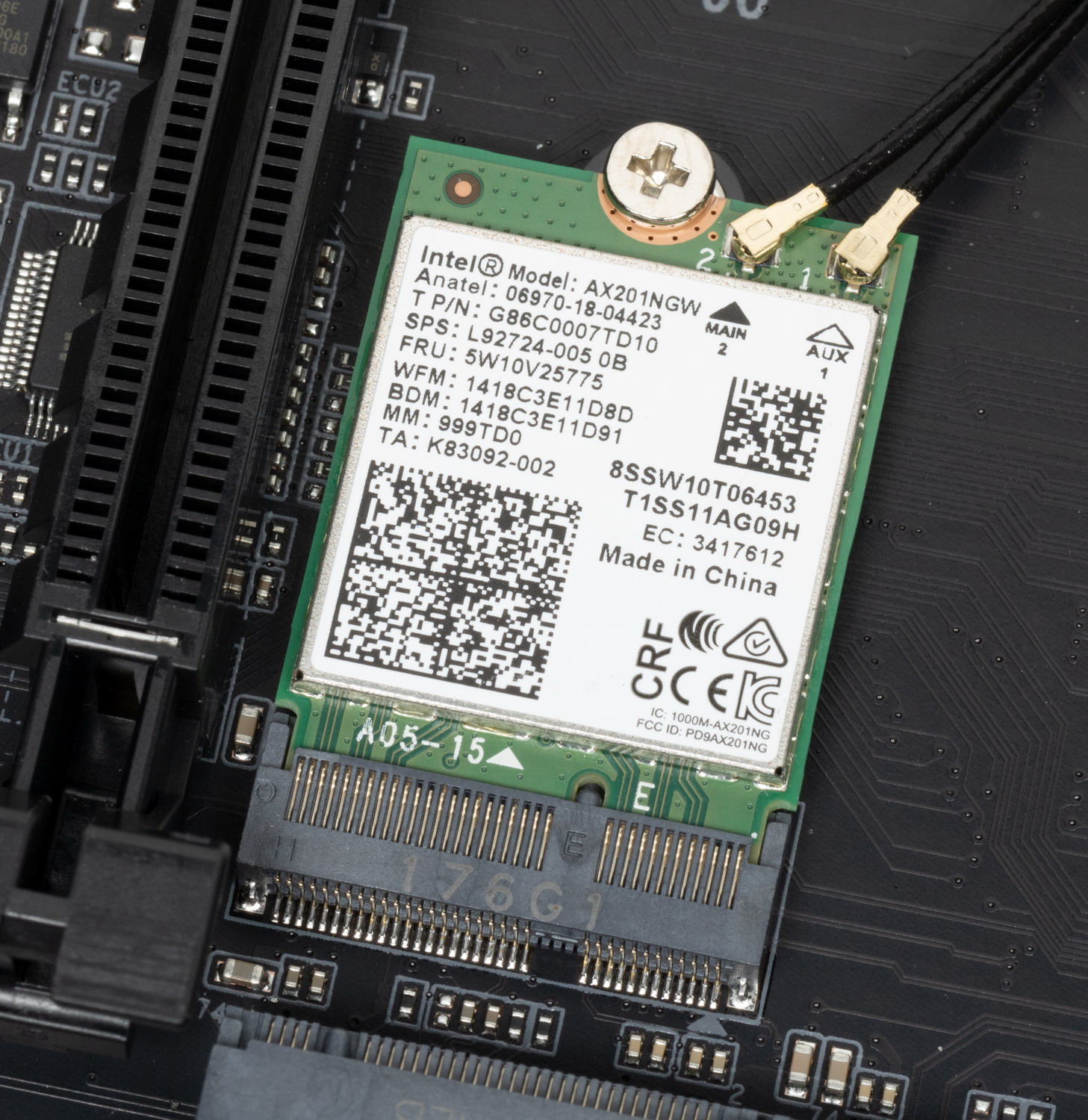Также есть комплексный беспроводной адаптер на контроллере Intel AX-201NGW, через который реализованы Wi-Fi 6E (802.11a/b/g/n/ac/ax) и Bluetooth 5.2. Он установлен в слот M.2 (E-key), и его разъемы для привинчивания выносных антенн выведены на заднюю панель.