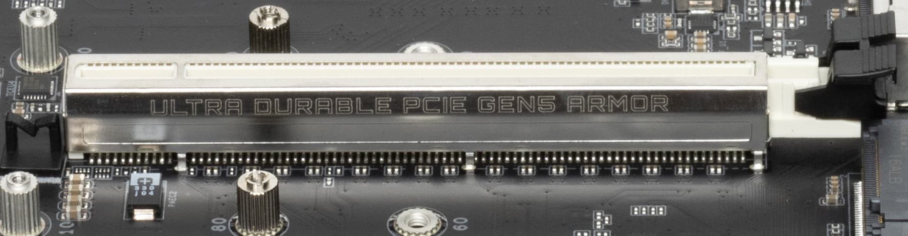 Первый слот PCIe x16_1 имеет металлическое армирование из нержавеющей стали, которое увеличивает надежность (что может быть важным в случае довольно частой смены видеокарт, но что более важно: такой слот легче выдержит нагрузку на изгиб в случае установки очень тяжелой видеокарты топового уровня. Кроме того, такая защита предохраняет слоты от электромагнитных помех.