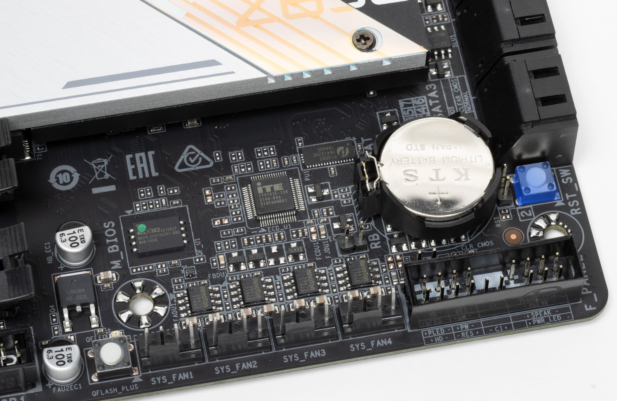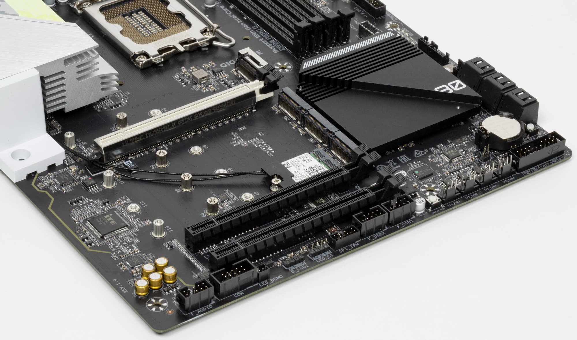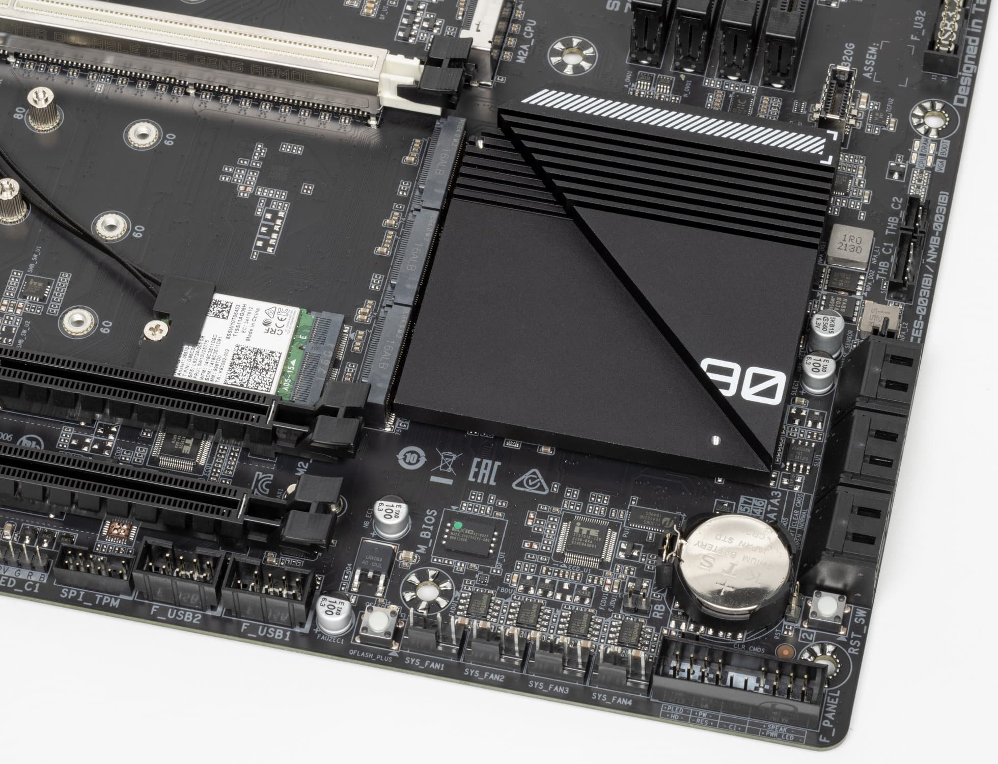 Все M.2 слоты имеют радиаторы. Верхний M2A_CPU обладает отдельным радиатором (о нем особо расскажу в разделе питания и охлаждения), когда как остальные слоты M.2 имеют общий радиатор (причем с чипсетом).