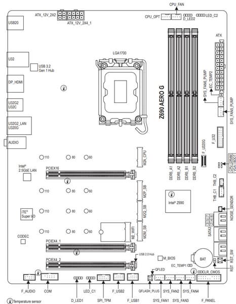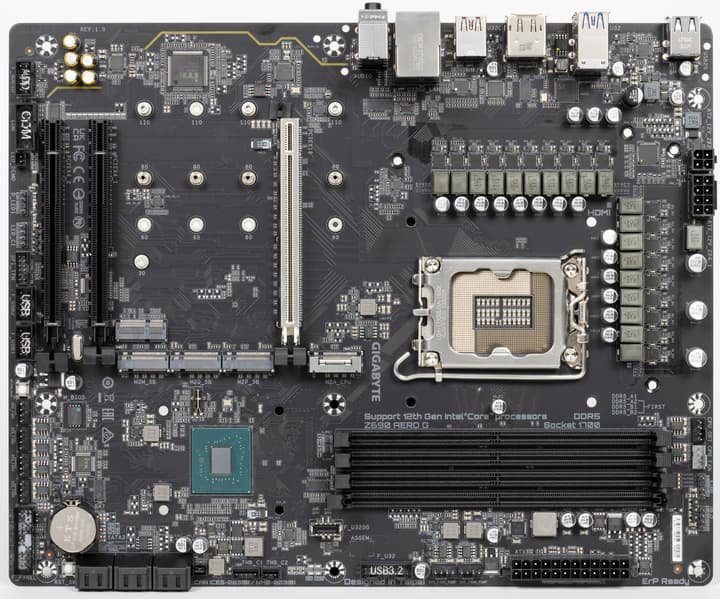 Форм-фактор ATX имеет размеры до 305×244 мм, а E-ATX — до 305×330 мм. Материнская плата Gigabyte Z690 Aero G имеет размеры 305×244 мм, поэтому выполнена в форм-факторе ATX, и на ней имеются 9 монтажных отверстий для установки в корпус. Однако следует иметь в виду, что одно из девяти монтажных отверстий перекрыто радиатором для слота M.2.