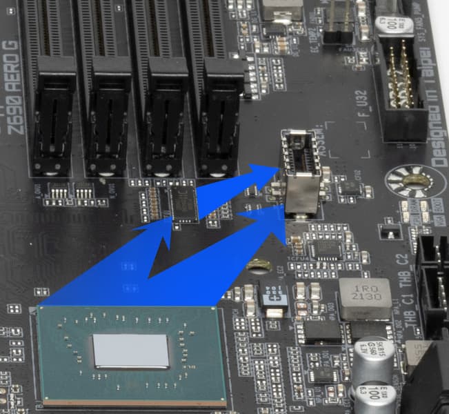Процессоры Intel Core 12-го поколения (совместимые с сокетом LGA1700 и поддерживаемые Z690) имеют 20 линий ввода-вывода (16 PCIe 5.0, 4 PCIe 4.0), не имеют USB и SATA портов. При этом взаимодействие с Z690 идет по особому каналу Digital Media Interface 4.0 (DMI 4.0 x8). Все PCIe линии процессора идут на слоты расширения PCIe и порт М.2. Serial Peripheral Interface (SPI) используется для взаимодействия с системой UEFI/BIOS, а шина Low Pin Count (LPC) — для связи с устройствами ввода/вывода, не требующими высокой пропускной способности (контроллерами вентиляторов, TPM, старой периферии).