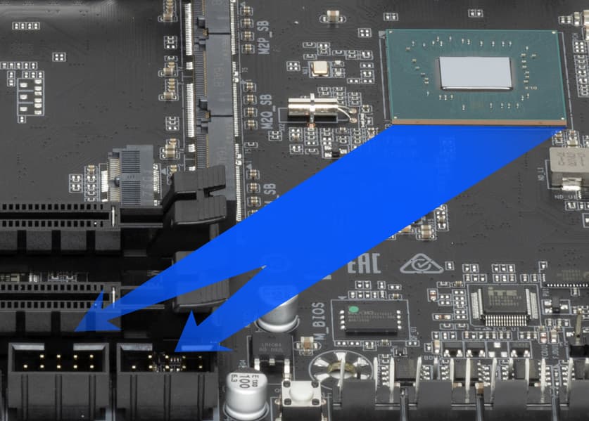 Второй, третий и четвертый слоты M.2 (M2P_SB, M2Q_SB, M2M_SB) получают данные от чипсета Z690 (PCIe 4.0), а первый M2A_CPU — от CPU (PCIe 4.0). При этом только М2M_SB поддерживает модули с любым интерфейсом, а все остальные работают с модулями только с PCIe интерфейсом. Следует иметь в виду, что М2М_SB делит ресурсы с портами SATA_2/3.