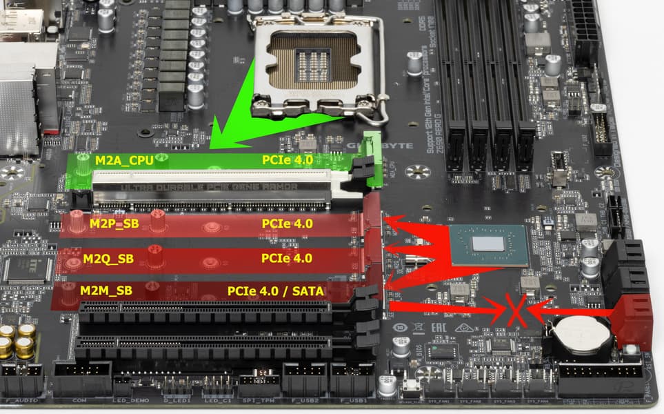 - Переключатель: или слот M2M_SB (4 линии PCIe 4.0); или порты SATA_2,3 (2 линии) (максимум 4 линии PCIe 4.0);