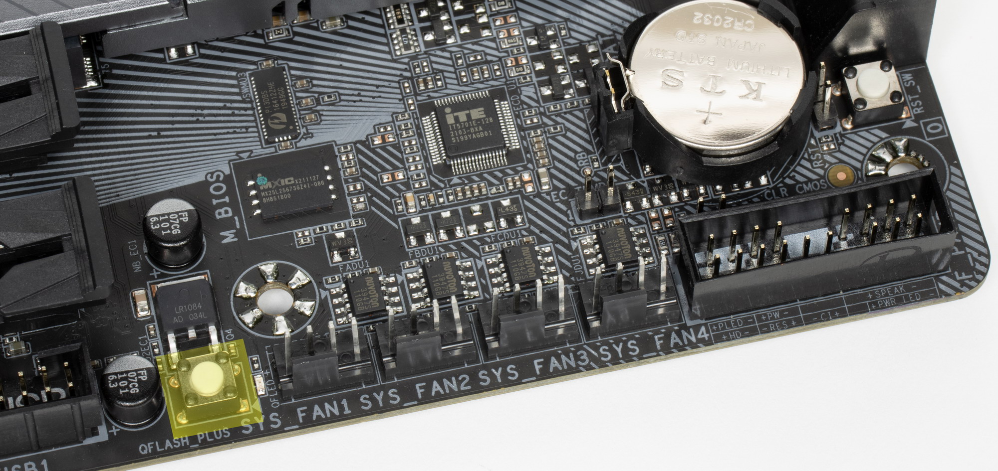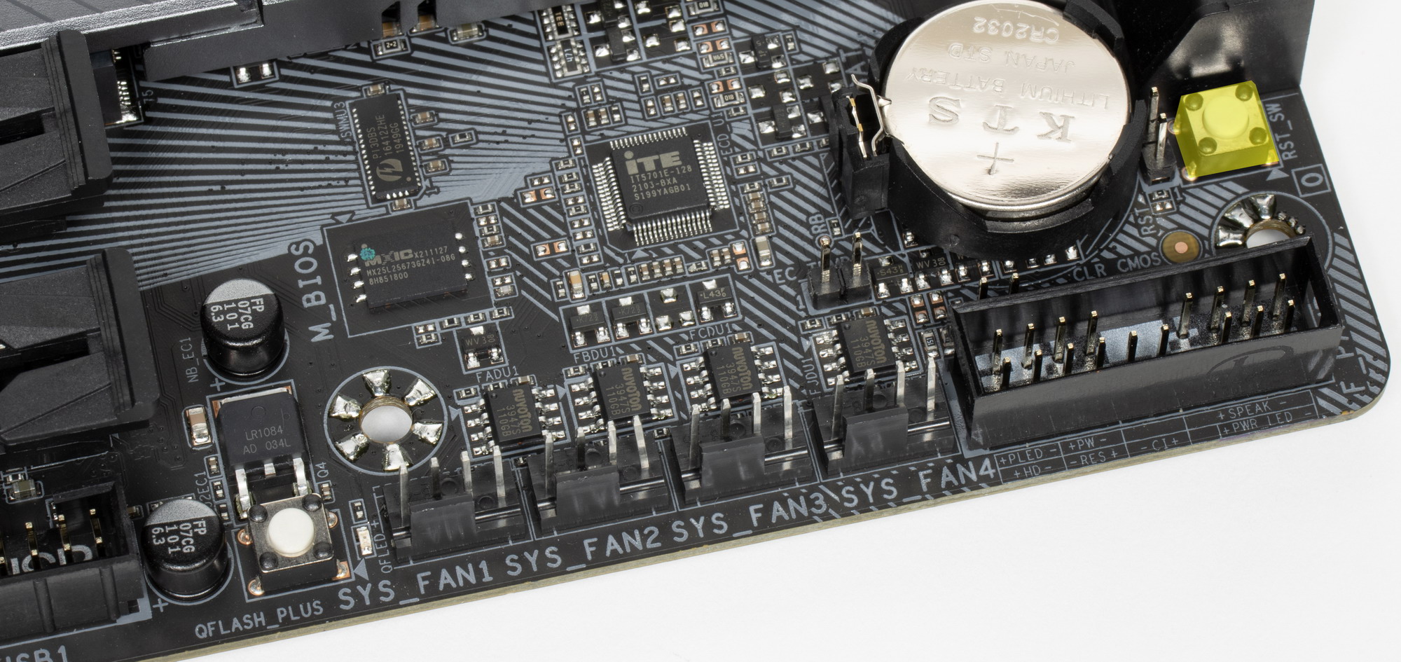 | Прочие внутренние элементы | 24-контактный разъем питания ATX 1 8-контактный разъем питания EPS12V 1 4-контактный разъем питания EPS12V 1 слот M.2 (E-key), занят адаптером беспроводных сетей 1 разъем для подключения порта USB 3.2 Gen2×2 Type-C 1 разъем для подключения 2 портов USB 3.2 Gen1 2 разъемa для подключения 4 портов USB 2.0 8 разъемов для подключения 4-контактных вентиляторов и помп ЖСО 4 разъема для подключения подсветки (2 неадресуемой RGB-ленты и 2 адресуемой ARGB-ленты) 1 разъем для термодатчикa 1 разъем для датчикa шума 1 разъем для подключения адаптера управления с передней панели корпуса 1 кнопка прошивки BIOS Q Flash Plus 1 кнопка запуска 1 кнопка перезагрузки Reset |
