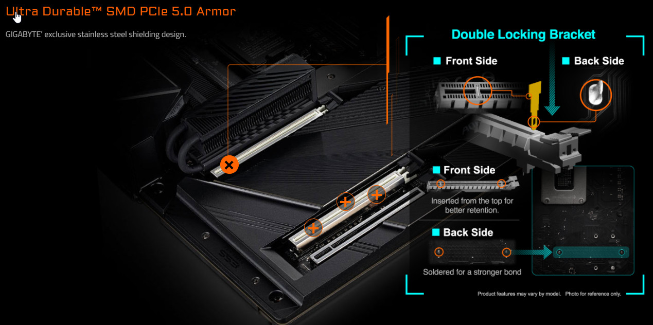 Все три слота PCIe x16 имеют металлическое армирование из нержавеющей стали, которое увеличивает их надежность (что может быть важным в случае довольно частой смены видеокарт, но что более важно: такой слот легче выдержит нагрузку на изгиб в случае установки очень тяжелой видеокарты топового уровня. Кроме того, такая защита предохраняет слоты от электромагнитных помех.