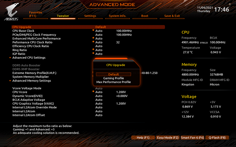 Полагаю, что если без ручного вмешательства автоматически выставляется 4.9 ГГц по всем P-ядрам, и 3.7 ГГц по всем Е-ядрам — это просто замечательно! Стоит напомнить, что Р-ядра — это обычные всем привычные ядра, имеющие по 2 потока каждый, «Р» — означает Performance, то есть производительные. «Е» — это энергоэффективные ядра, так называемые, малые ядра, у них по 1 потоку. Второй раз уже мы видим, что система по умолчанию, определив очень мощное питание матплаты, выставила очень приличный авторазгон.