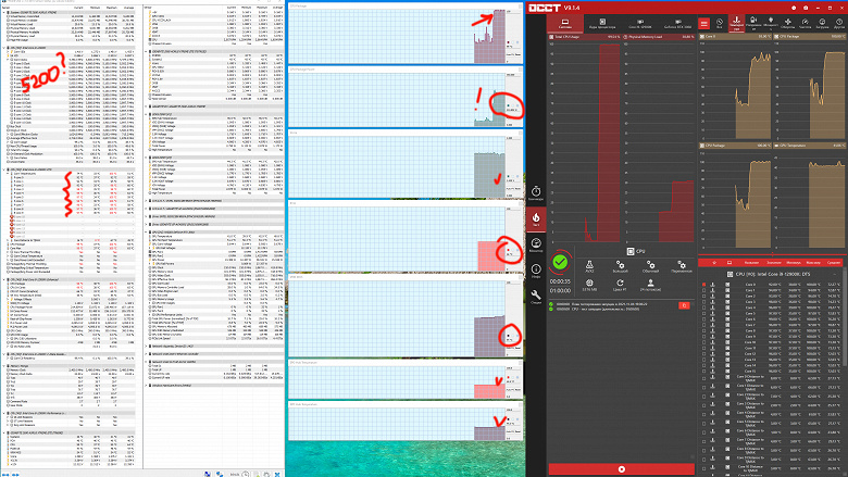 О как! Умные электроны там где-то внутри UEFI сообразили, что 5200 МГц — чрезмерно много, перегревается все, нужна более мощная СО, и сами понизили частоту Р-ядер до 5100 МГц. Хоть нагрев процессора уже подходил к критическому, троттлинга не было, все остальные параметры работы в норме.